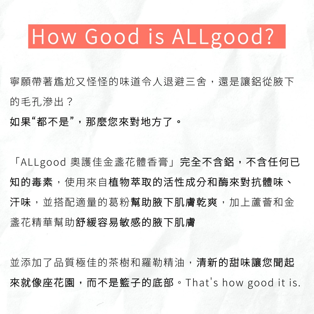 ALLgood 金盞花體香膏 70g 天然體香棒 體香膏 香膏 汗味剋星 無丙烯 鋁鹽 玫瑰茉莉/低敏無香/茶樹羅勒