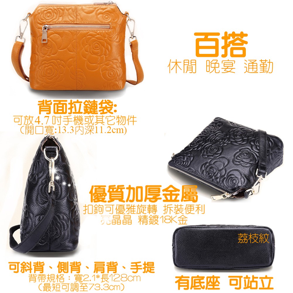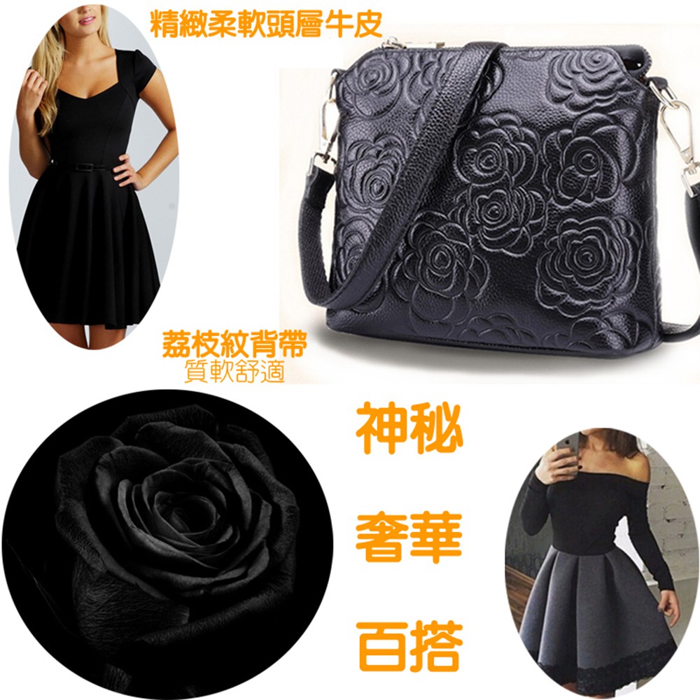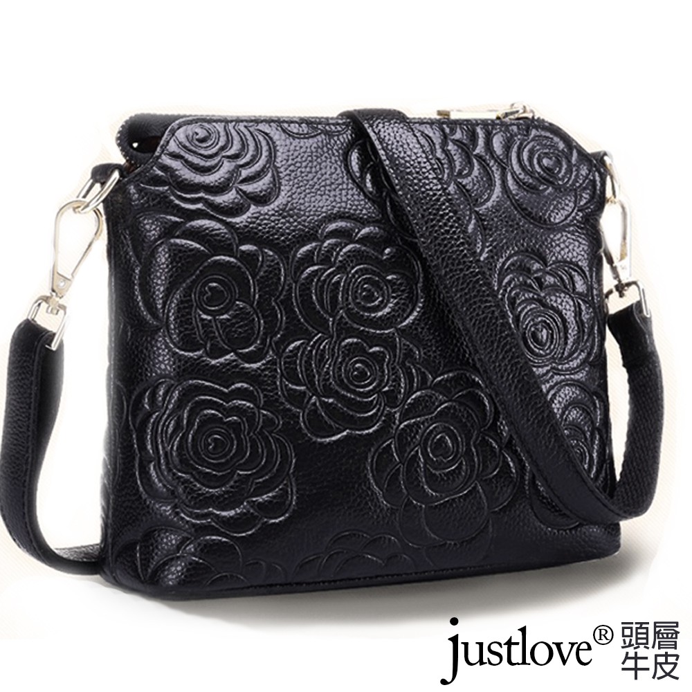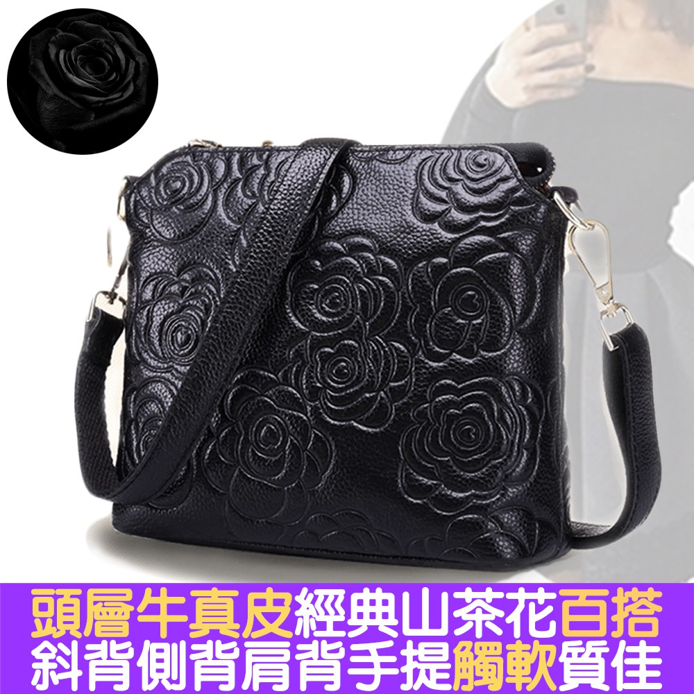 [現貨台南] <justlove>名牌風經典時尚頭層牛皮山茶花真皮拉鏈女包斜背側背肩背手提包(05K35-8)黑