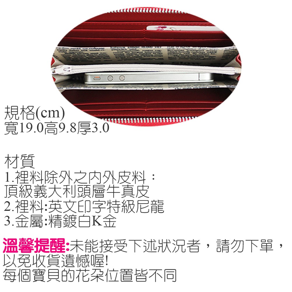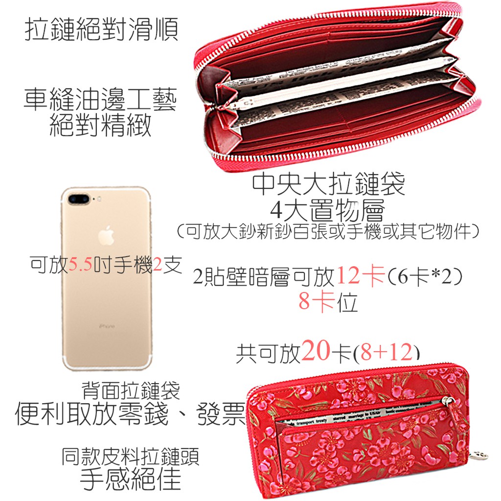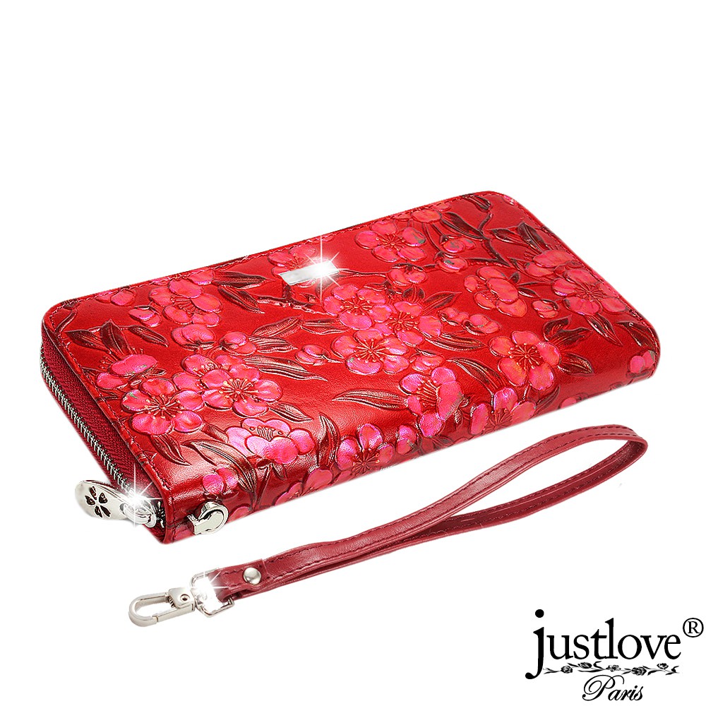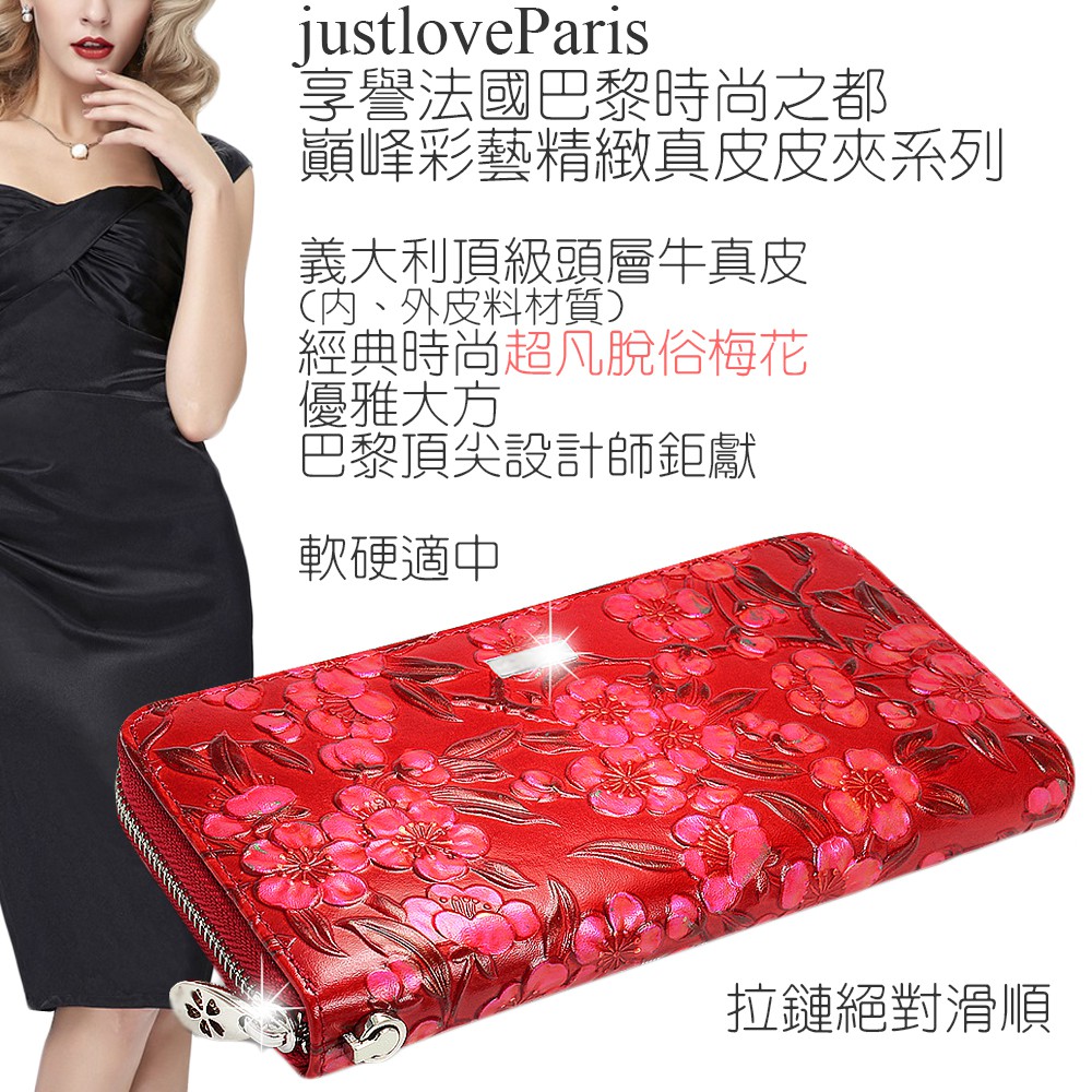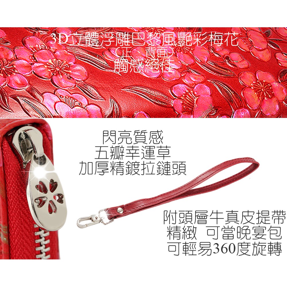 [現貨台南] <justlove>法國名品進口頭層牛皮浮雕梅花真皮拉鏈女長夾皮夾附腕帶手拿包晚宴包(01K08-7)紅