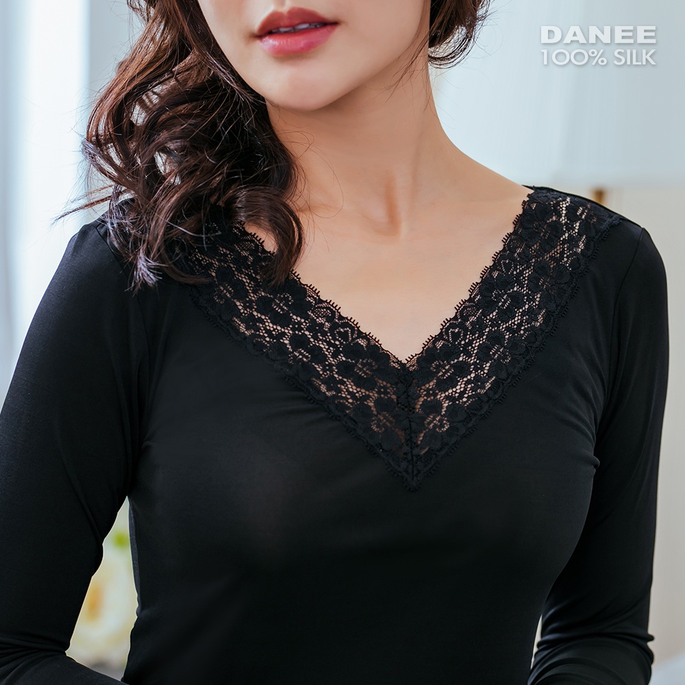 【岱妮蠶絲】純蠶絲長袖V領蕾絲衛生衣上衣(紅、黑二色)