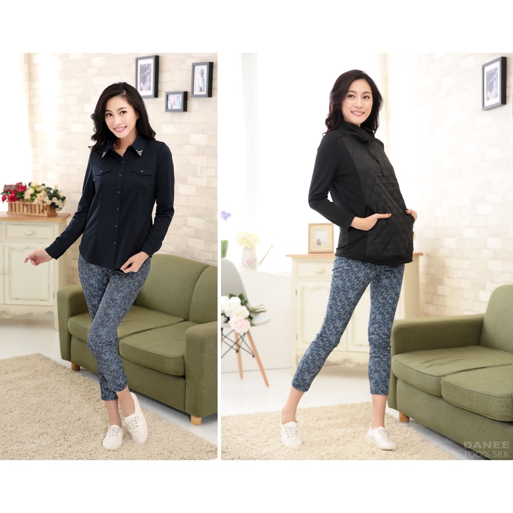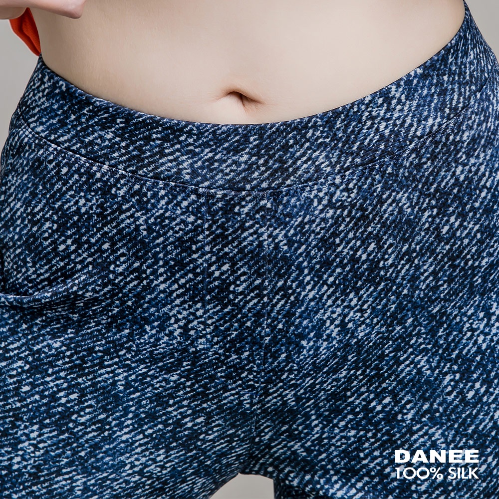 【岱妮蠶絲】藍白小碎花休閒蠶絲八分內搭褲(深藍)