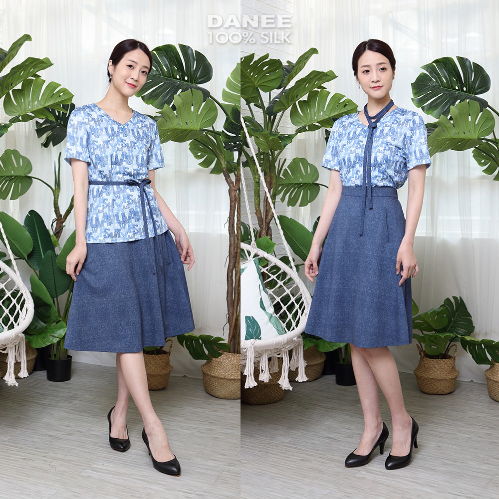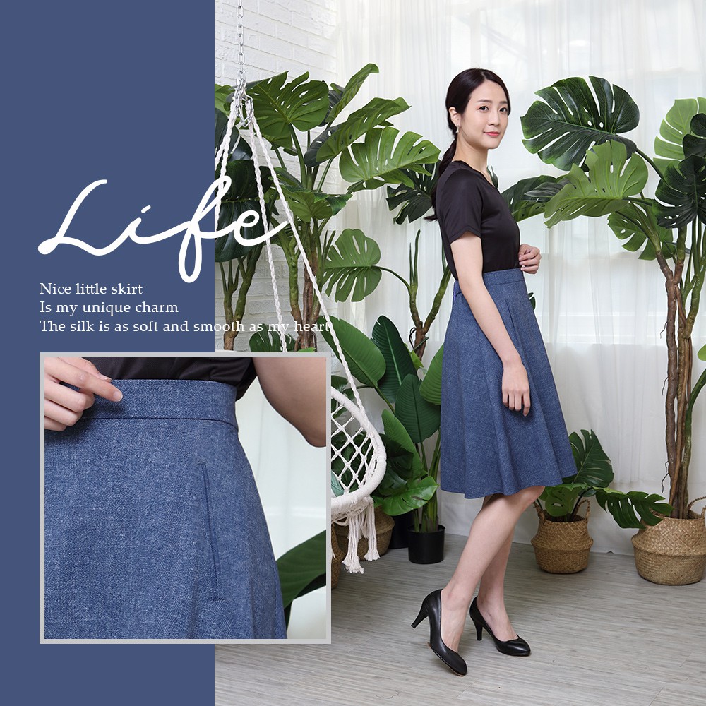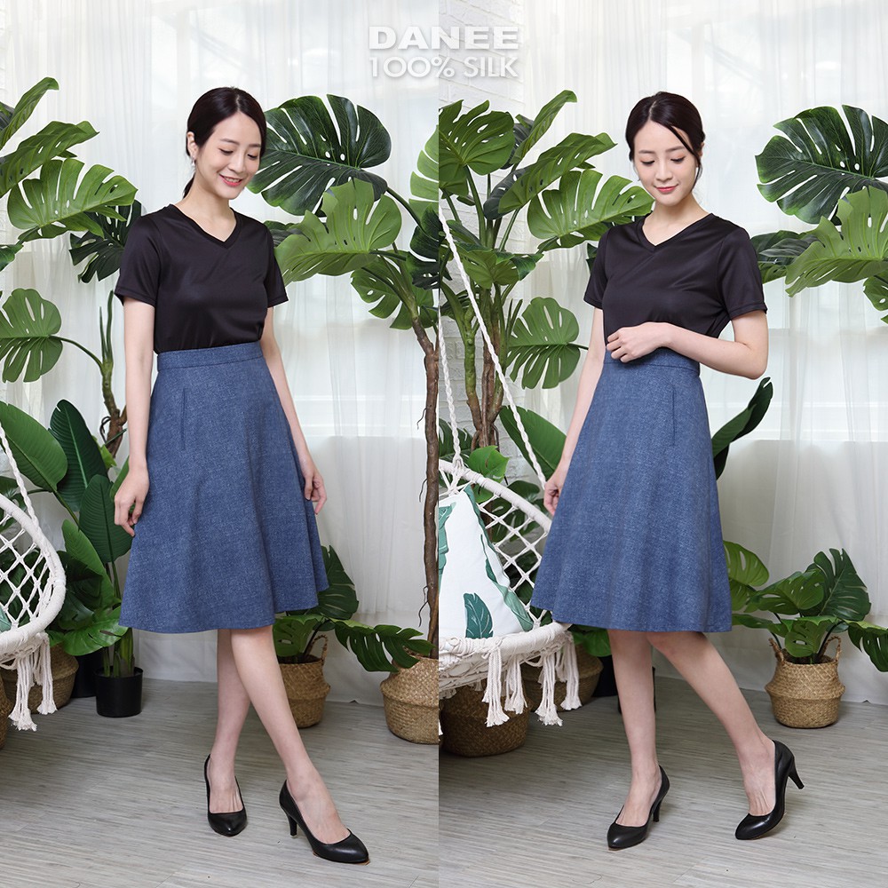 【岱妮蠶絲】仿牛仔紋蠶絲及膝A字五分裙