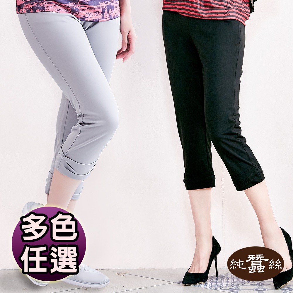 【岱妮蠶絲】造型褲腳蠶絲女七分褲(二色可選)