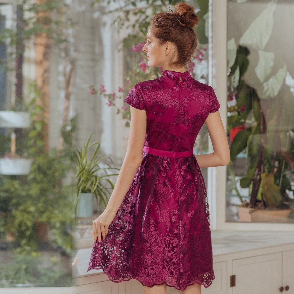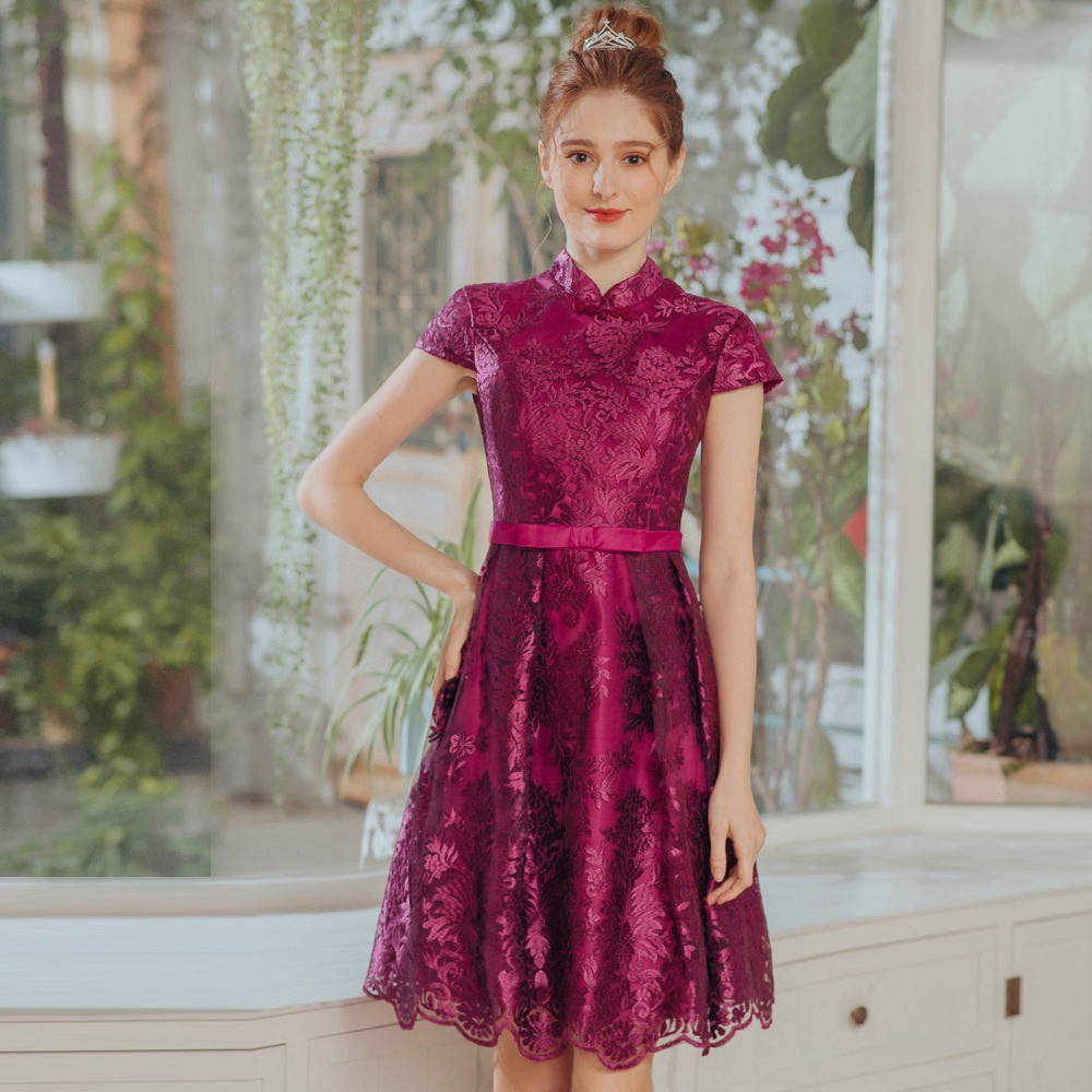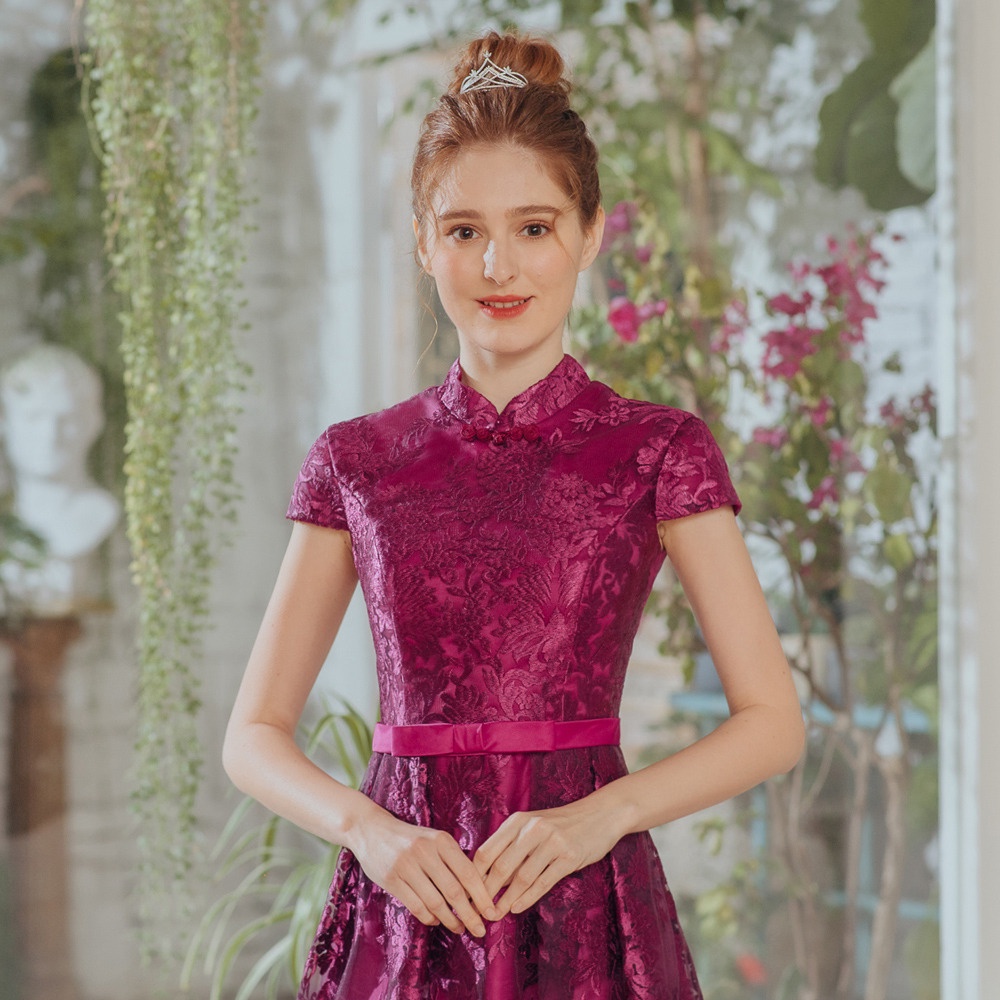 【OMUSES】蕾絲刺繡紫色旗袍短禮服18-1940