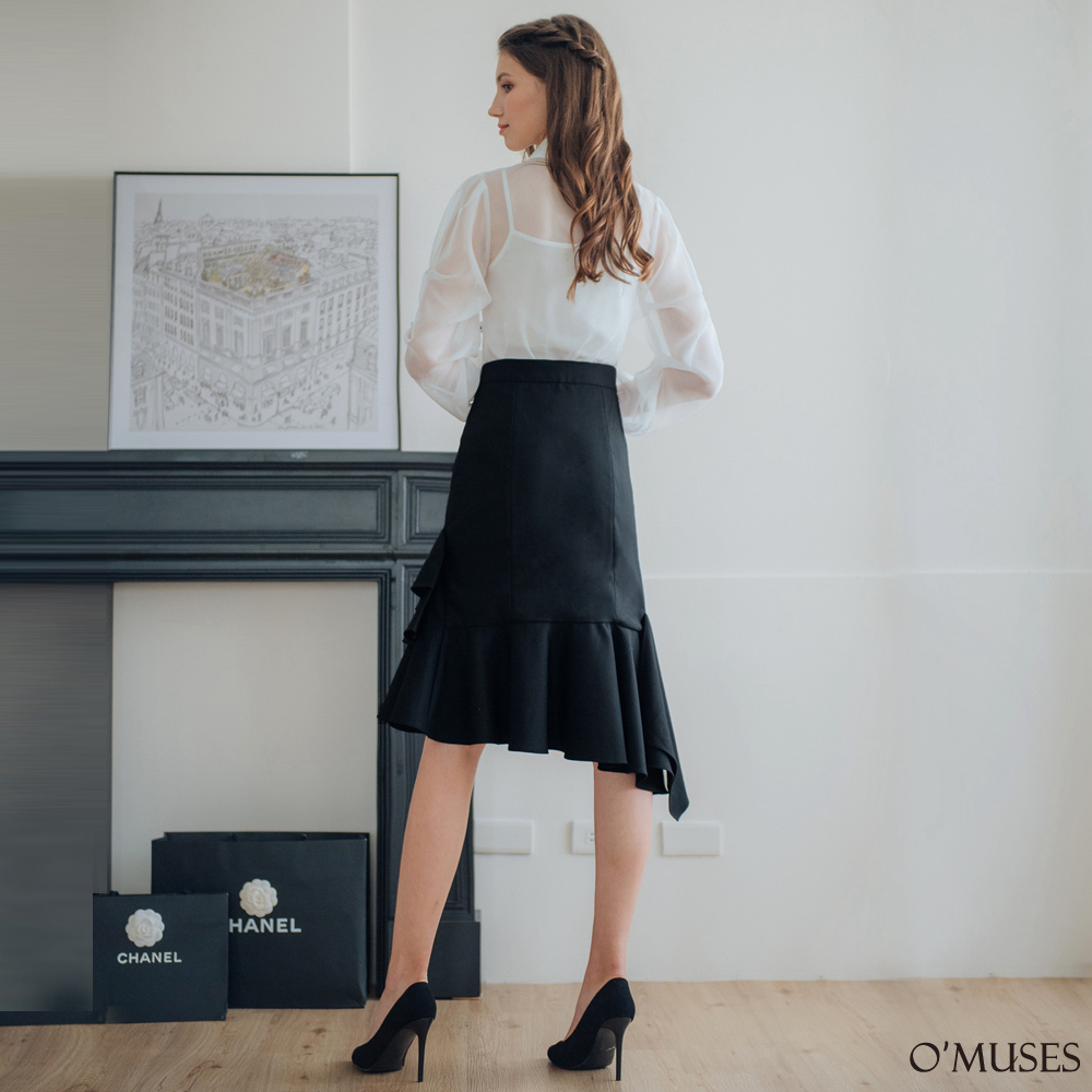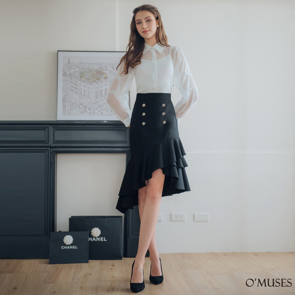 【OMUSES】排釦前短後長荷葉黑色短裙13-7054