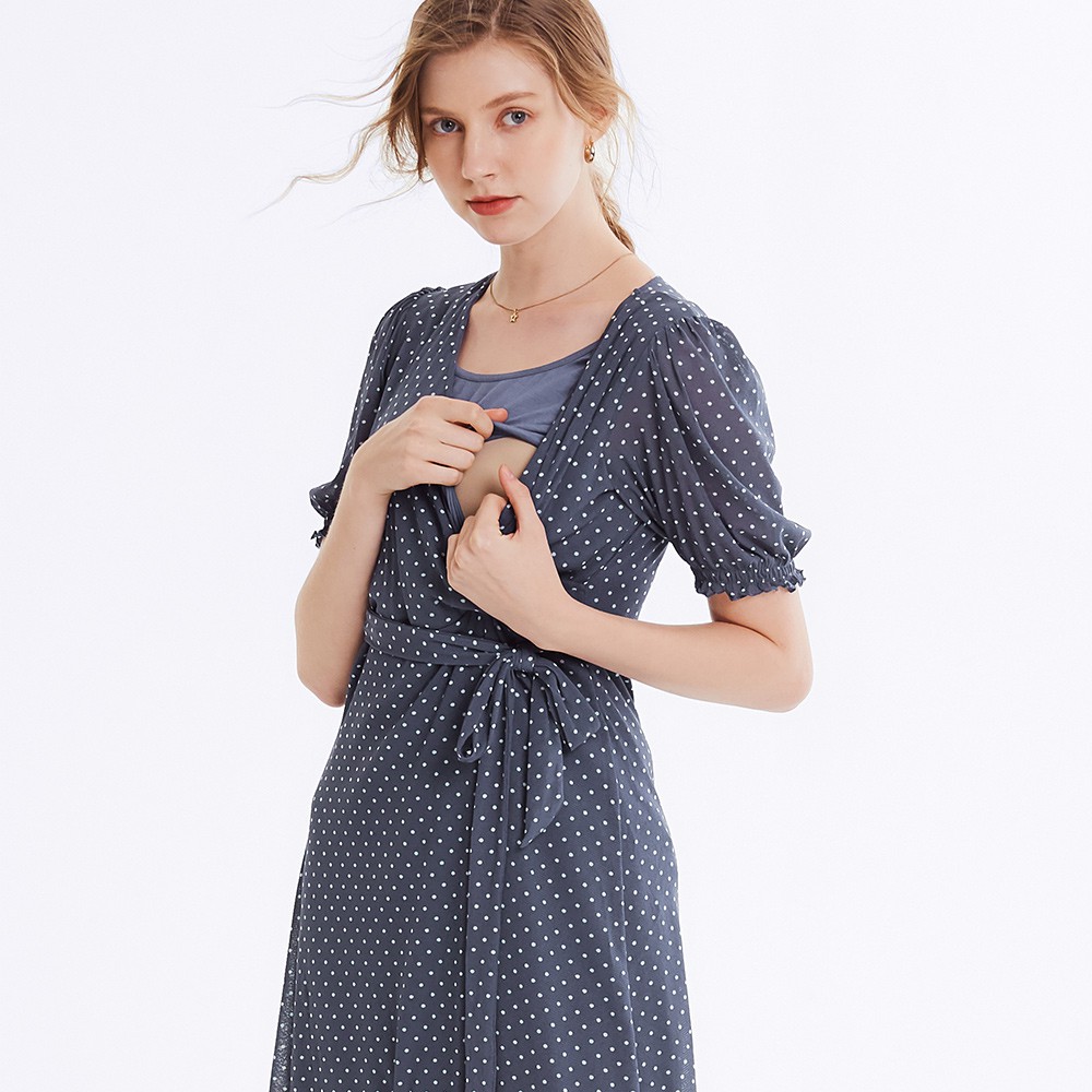 【mamaway 媽媽餵】拋拋袖綁帶孕哺洋裝(灰藍) 哺乳洋裝 涼爽透氣 孕婦洋裝