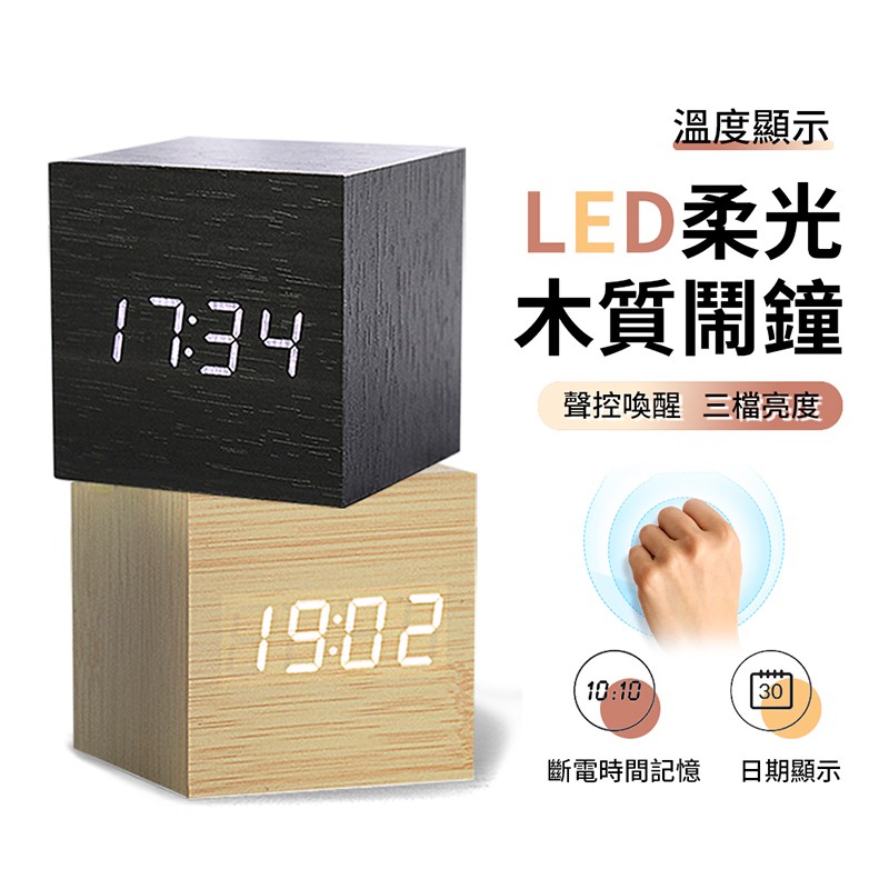 ANTIAN 創意聲控木紋方形時鐘 LED迷你鬧鐘 床頭定時鬧鐘 小夜燈電子鐘 現貨 蝦皮直送