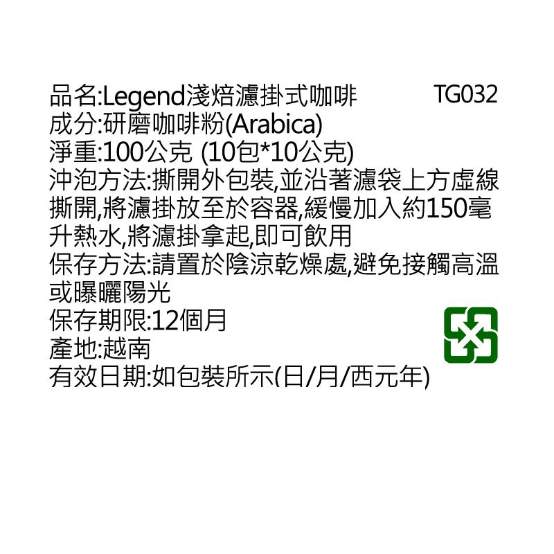 越南 Legend 傳奇 美式風味 淺焙風味 越式濃醇 濾掛式咖啡10包x10g/盒X1盒 現貨 廠商直送