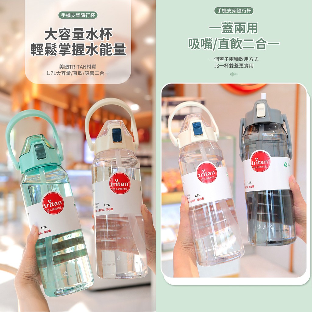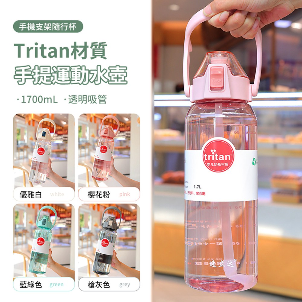 ANTIAN Tritan材質透明手提吸管運動水壺密封防漏大容量彈蓋防摔水瓶 戶外水杯 1700ml 現貨 蝦皮直送