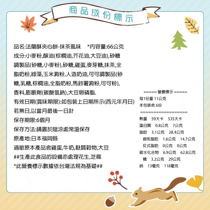 日本 七尾製菓 法蘭酥夾心餅-抹茶風味 (66g) 現貨 蝦皮直送