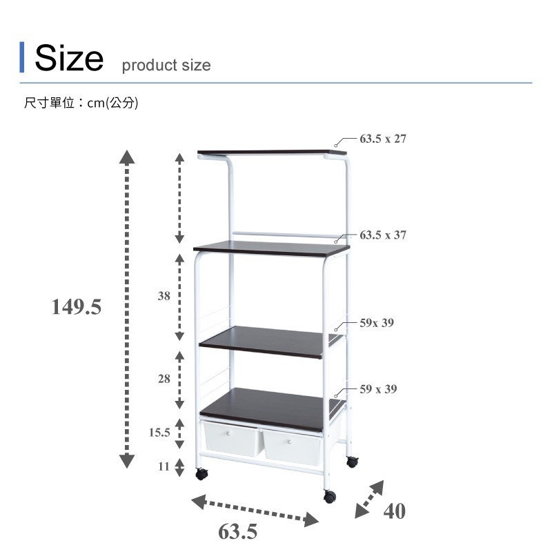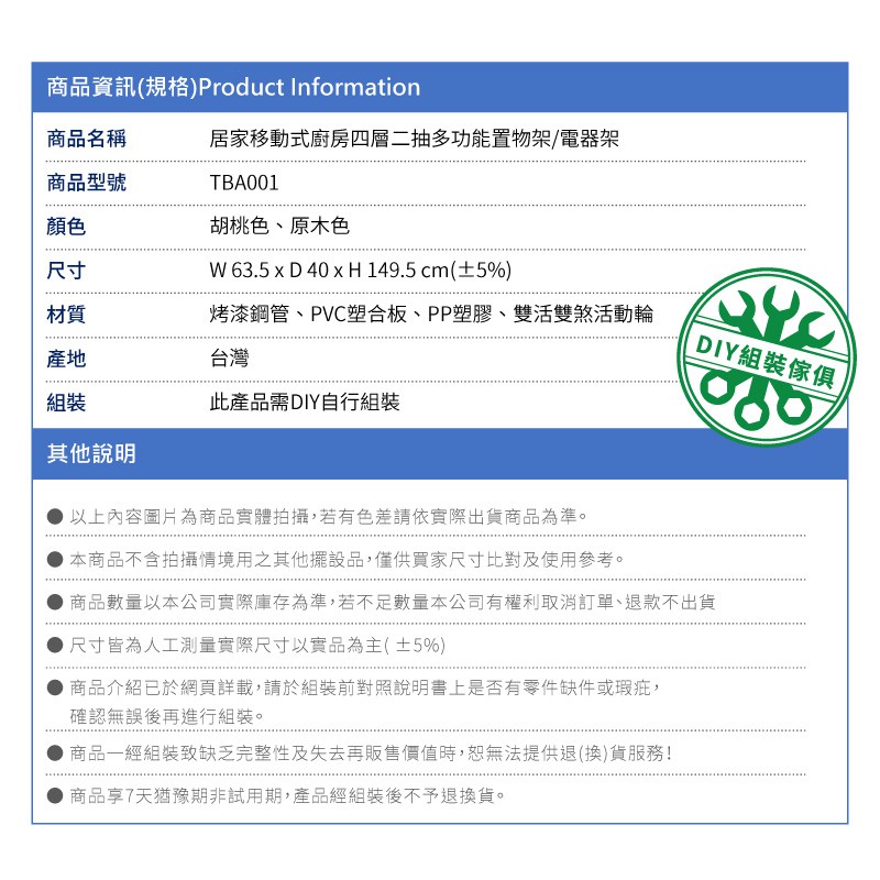 Amos 亞摩斯 居家移動式廚房四層二抽多功能置物架 TBA001 現貨 廠商直送