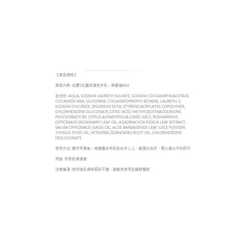 毛寶S 抗菌保濕洗手乳4kg SGS檢驗 無香精 現貨 蝦皮直送