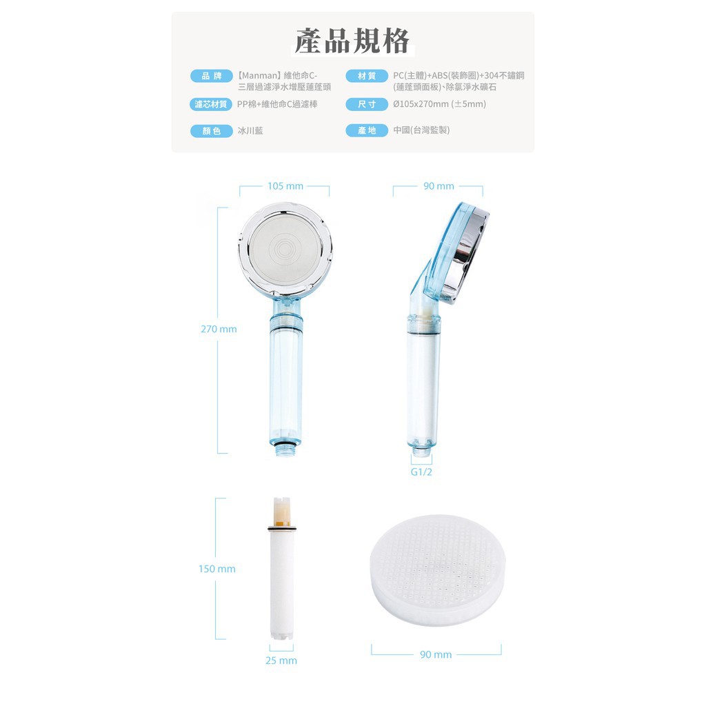 Manman 維他命C 三層過濾淨水增壓蓮蓬頭 浴室 濾芯 免運費 廠商直送