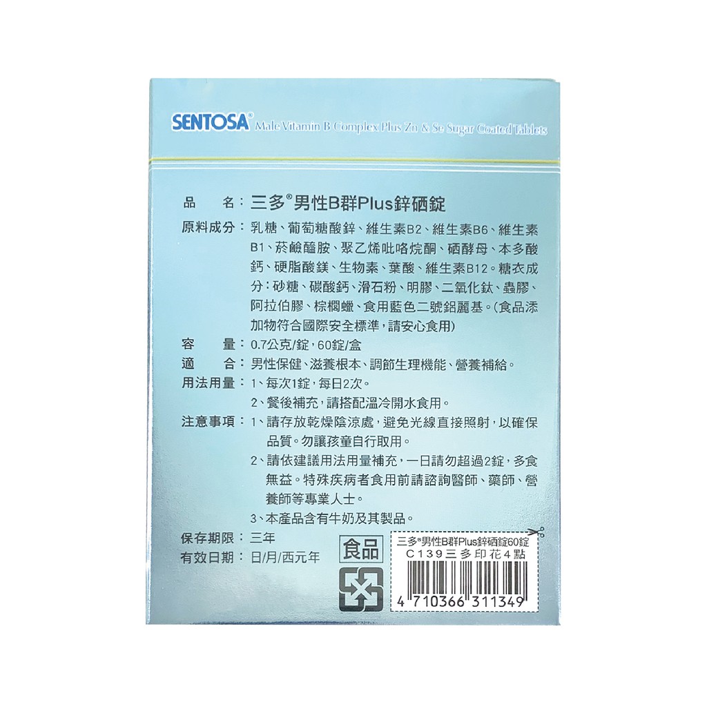 三多 男性B群Plus 鋅硒錠 60錠/盒 完整8種B群+生物素+鋅+硒 活力 滋養根本 現貨 蝦皮直送
