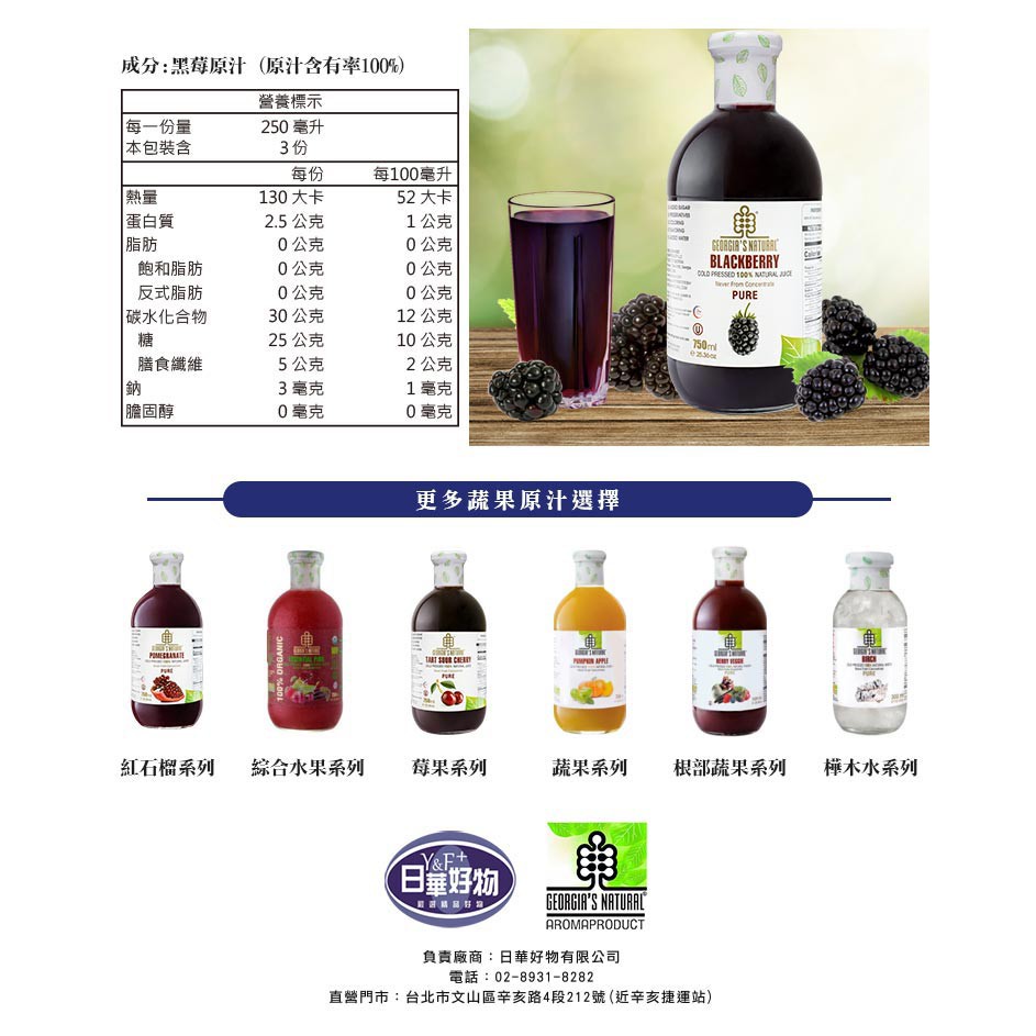 Georgia黑莓原汁(750ml/瓶) 非濃縮還原蔬果汁(超取勿超過2瓶以上)