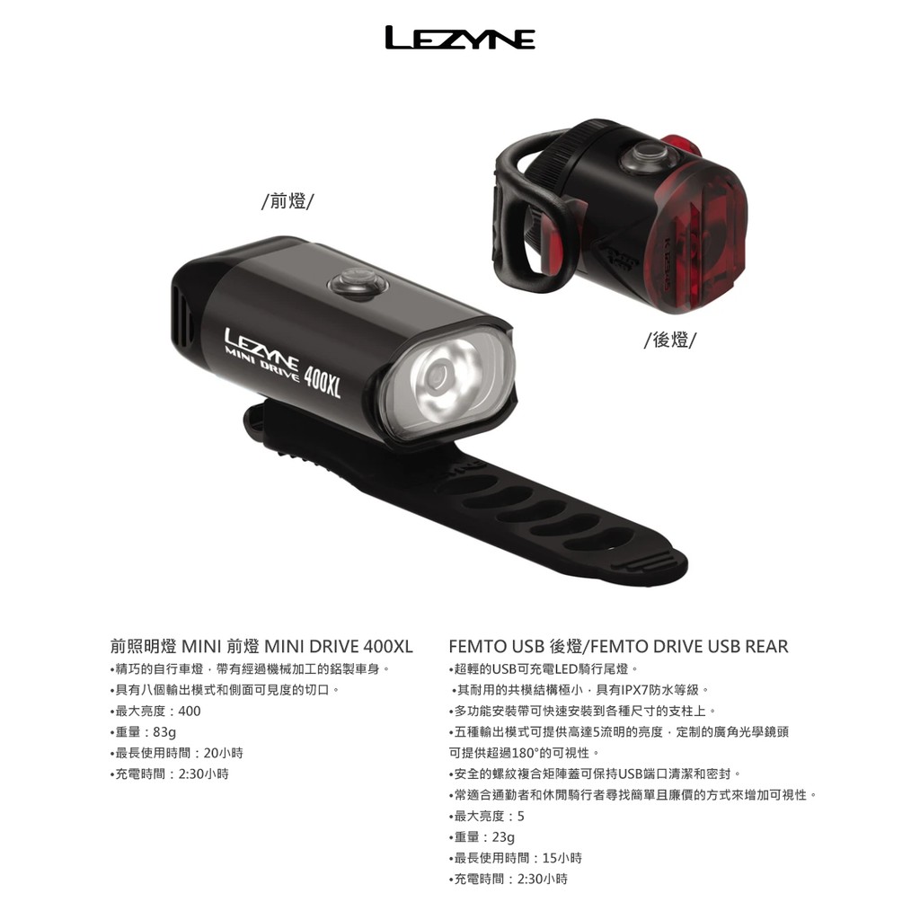 【LEZYNE】MINI DRIVE 400XL /FEMTO USB 自行車前後燈組