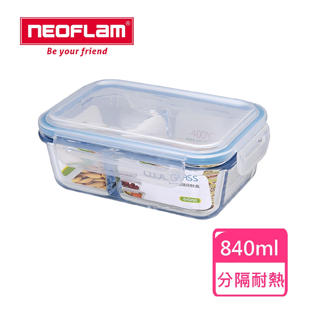 NEOFLAM 分隔耐熱玻璃保鮮盒長方形-840ml-台灣原廠公司貨