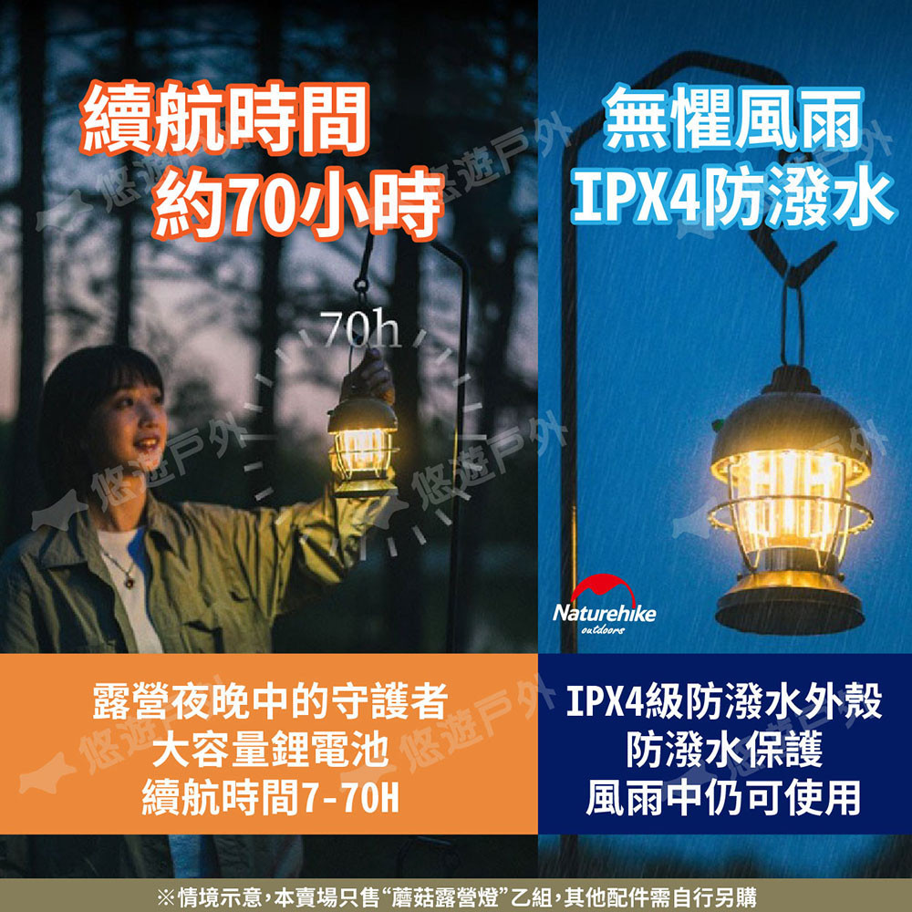 【Naturehike 挪客】蘑菇露營燈 黑色/灰綠色 手提氛圍燈 露營燈 提燈 吊燈 超長續航70H 露營 悠遊戶外