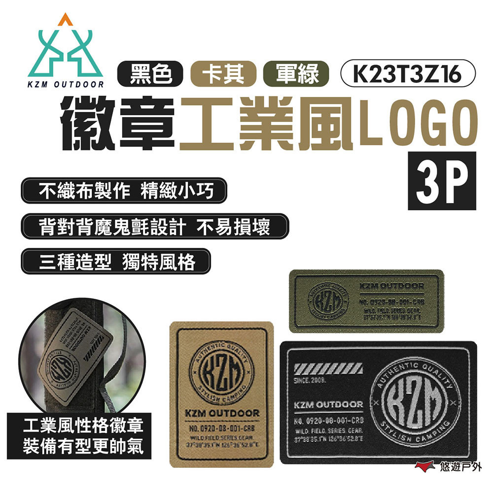 【KZM】徽章-工業風LOGO 3P K23T3Z16 三色 三種款式 魔鬼氈設計 不織布徽章 自由黏貼 露營 悠遊戶外
