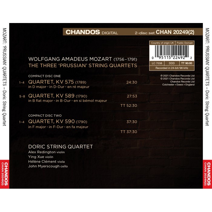 莫札特 普魯士四重奏1-3號 多利克弦樂四重奏 Mozart Prussian Quartets CHAN20249-2