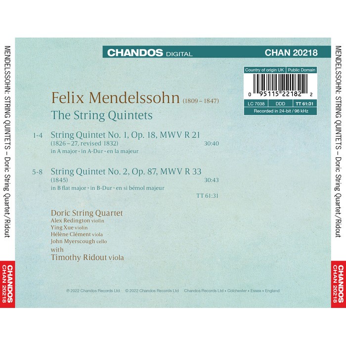 孟德爾頌 弦樂五重奏 多利克弦樂四重奏 Mendelssohn String Quintets CHAN20218