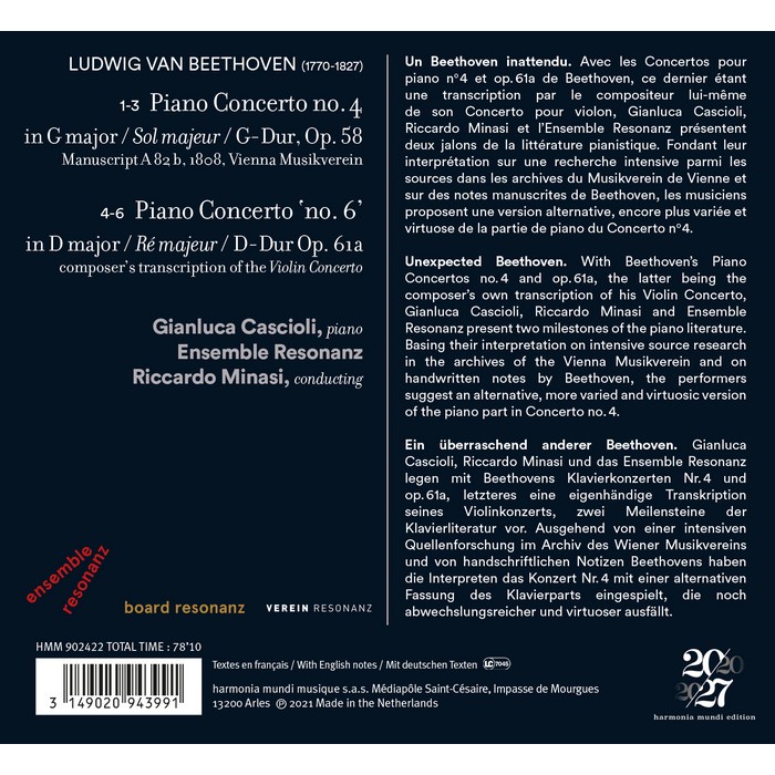 貝多芬 鋼琴協奏曲第4號 第6號 卡席歐里 Beethoven Piano Concertos HMM902422
