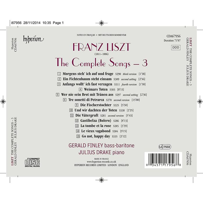 李斯特 藝術歌曲全集第三集 傑洛芬利 Gerald Finley Liszt Songs 3 CDA67956