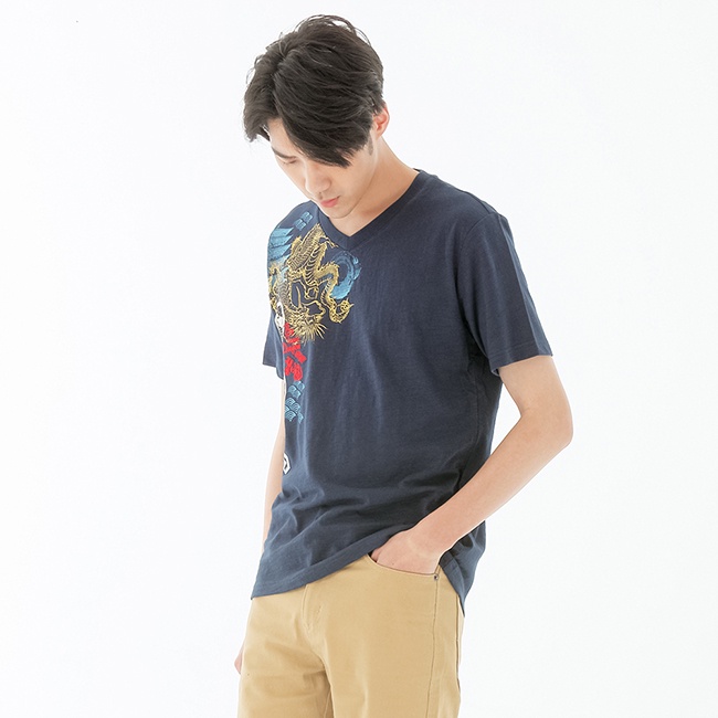 BIG TRAIN 狂龍家徽竹節棉V領男T-藍Z80178