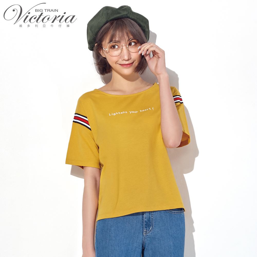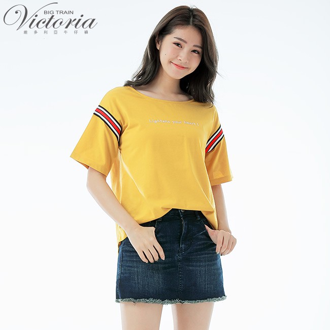 VICTORIA 撞色織帶前短後長寬鬆短袖T-芥黃V85468-36