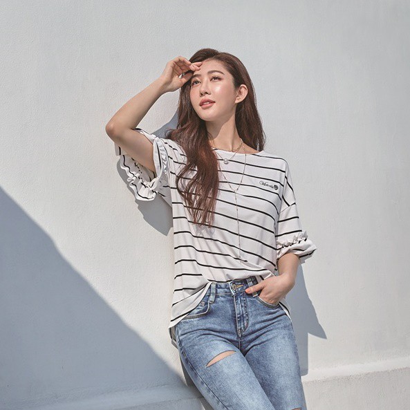 VICTORIA 寬版落肩荷葉袖條紋設計款 牙白V85509-81