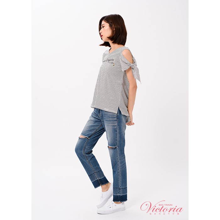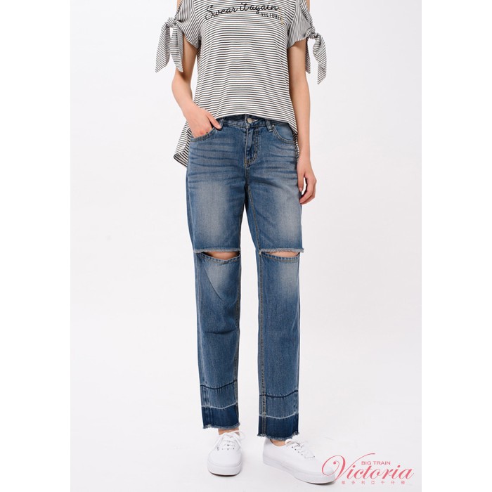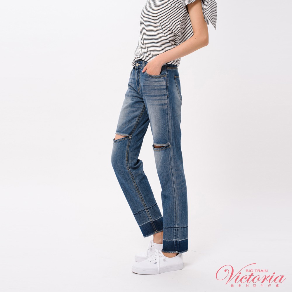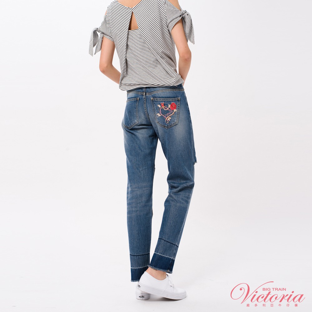 VICTORIA 中腰天絲棉剪接刺繡BF褲 -中藍