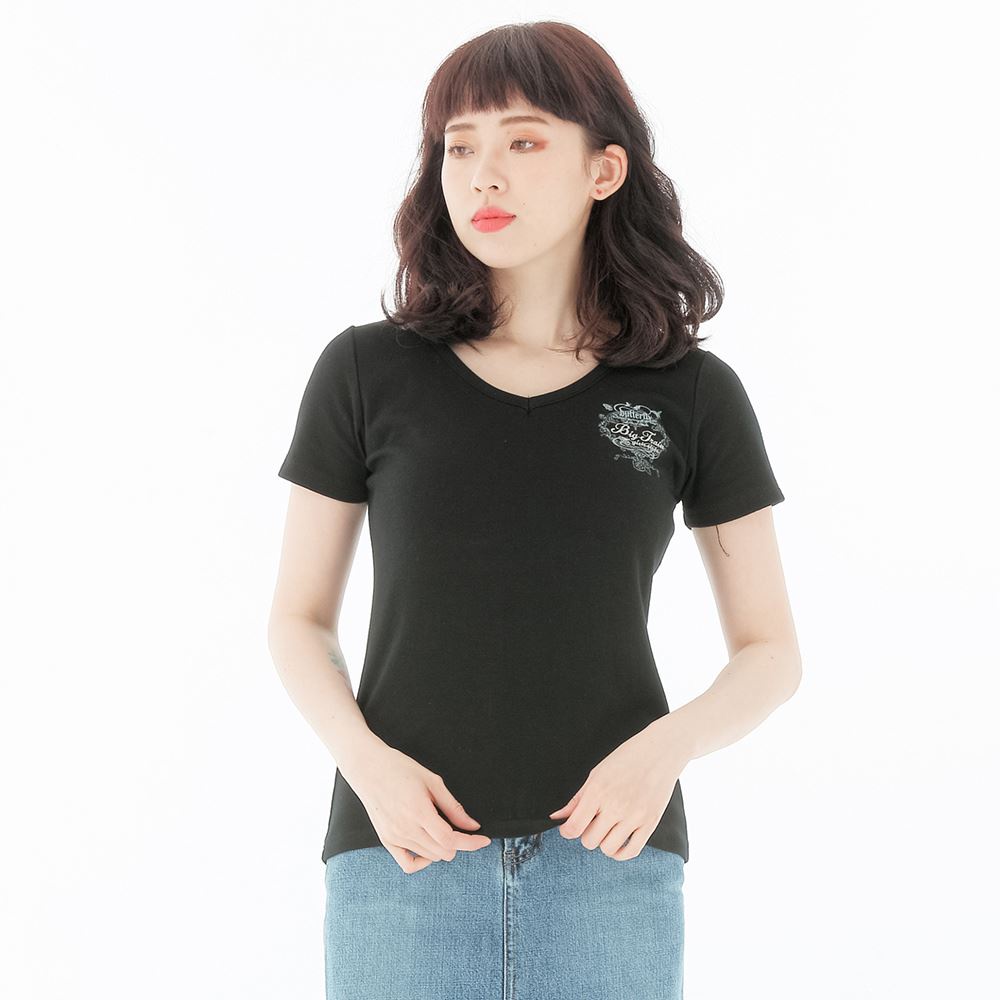 BIG TRAIN V領蕾絲貼繡蝴蝶超彈T-黑 B85285