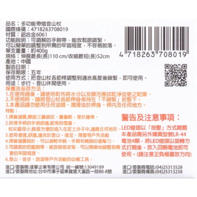 Treewalker 多功能帶燈登山杖-顏色隨機 52-110cm 1PC個 x 1【家樂福】