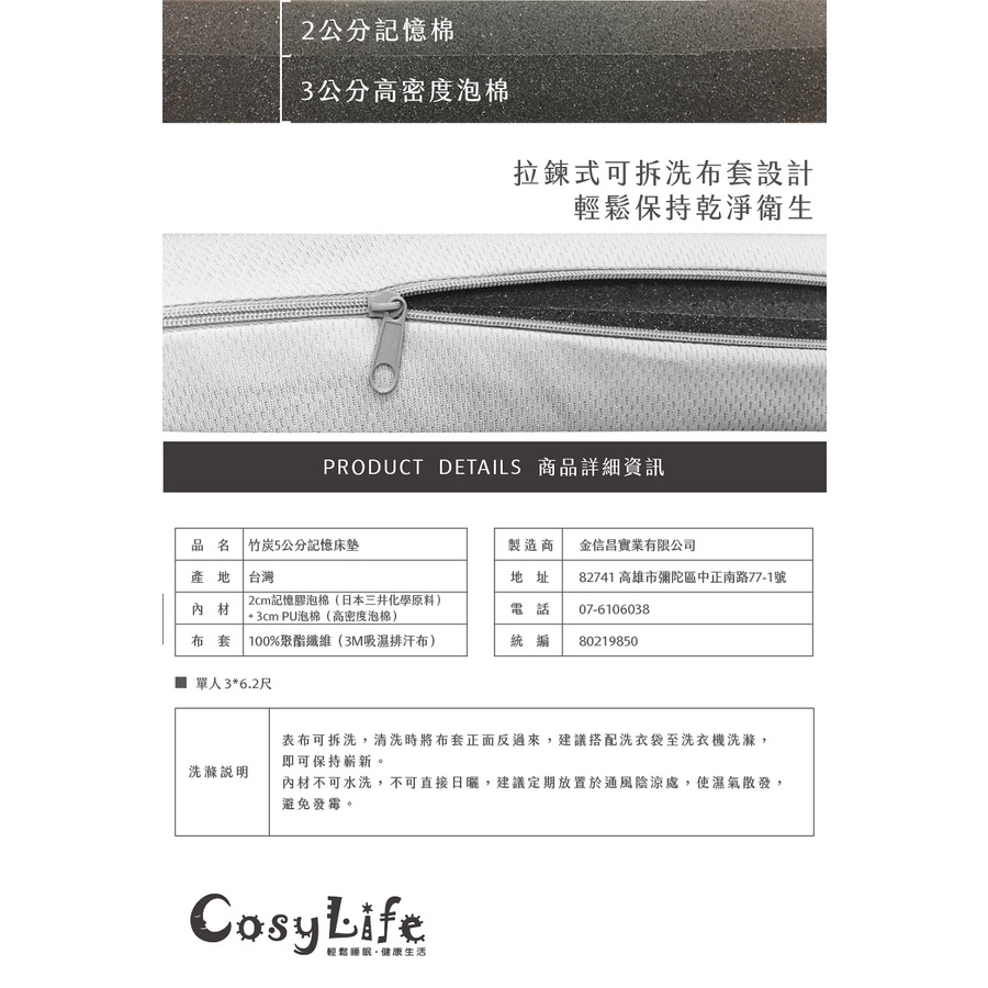 Hokun 竹炭5cm記憶床墊(單人) 1PC個 x 1【家樂福】