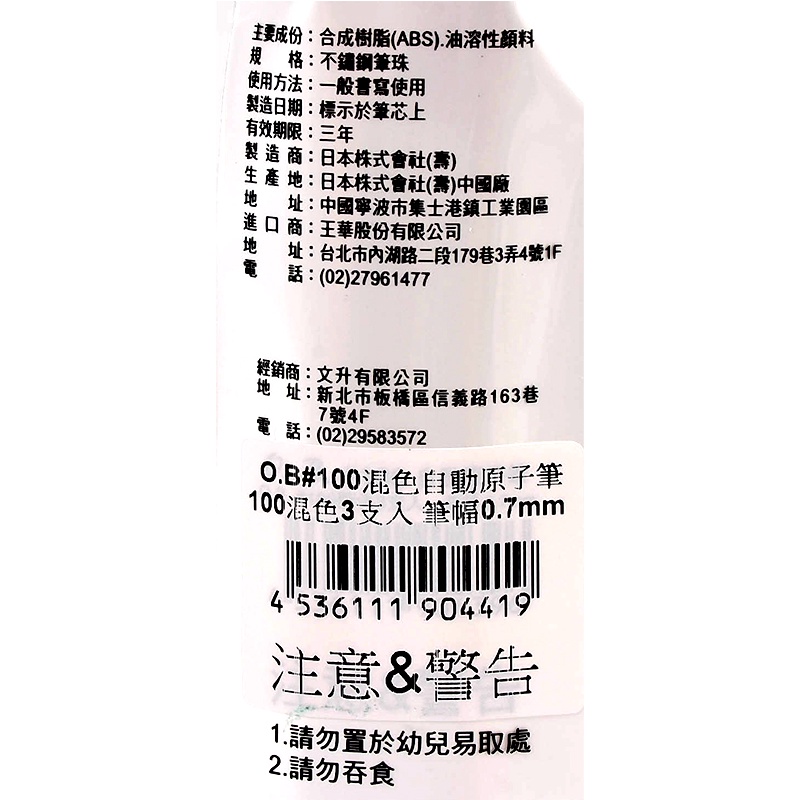 O.B 自動原子筆OB-100(混色) 1PC包 x 1【家樂福】