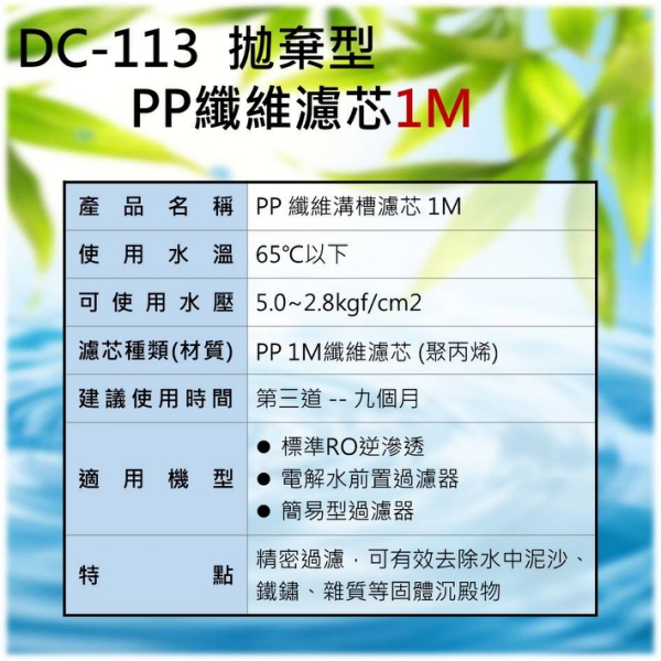 長江牌濾芯DC-113 拋棄型PP纖維濾芯 1M 餐飲濾水器 淨水器 RO純水機 電解水前置 飲水機 簡易型過濾器濾心