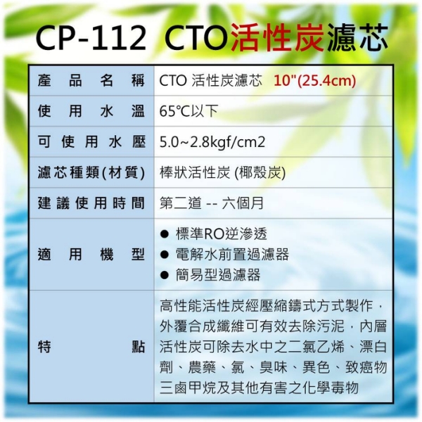 CP-112 CTO活性炭濾芯 餐飲濾水器 淨水器 水族箱 RO純水機 前置 飲水機 簡易型過濾器濾心 通用規格 10"