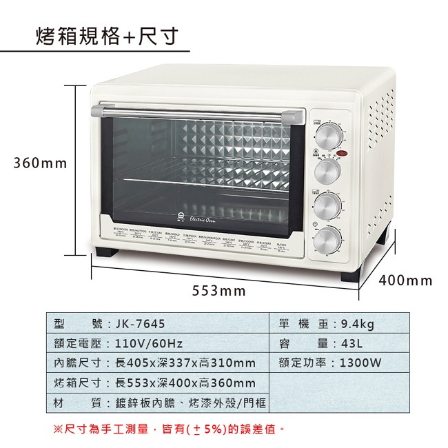 晶工牌43L雙溫控旋風電烤箱 JK-7645