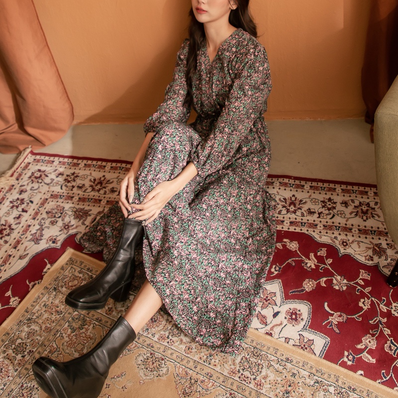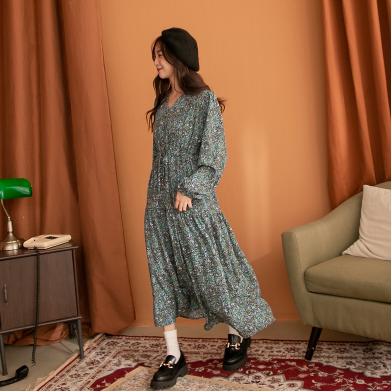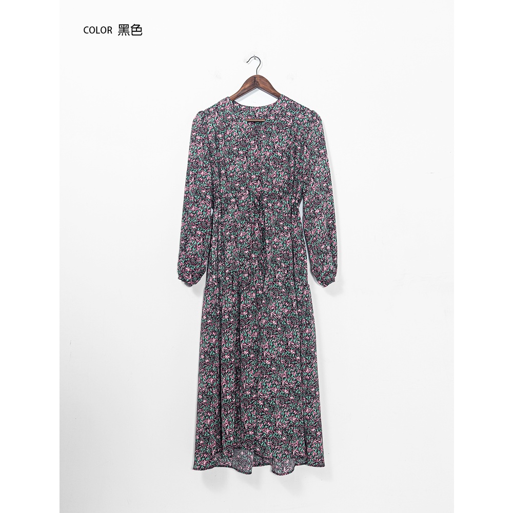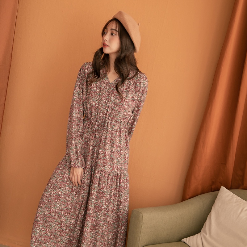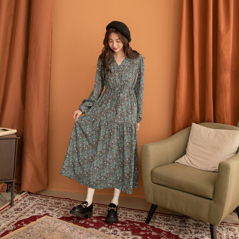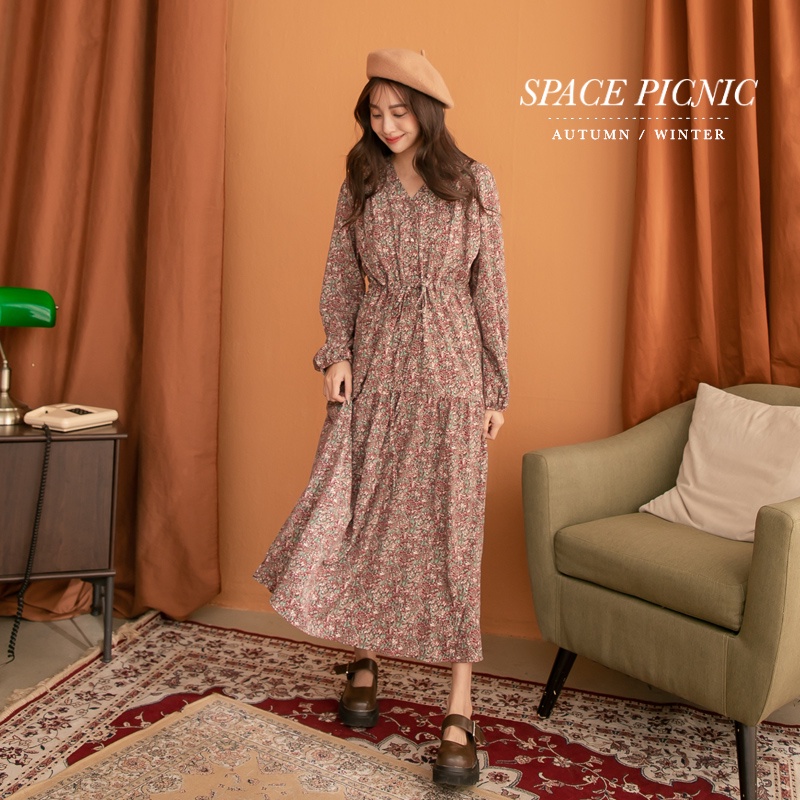 Space Picnic|V領腰抽繩花洋裝-3色【C21102041】