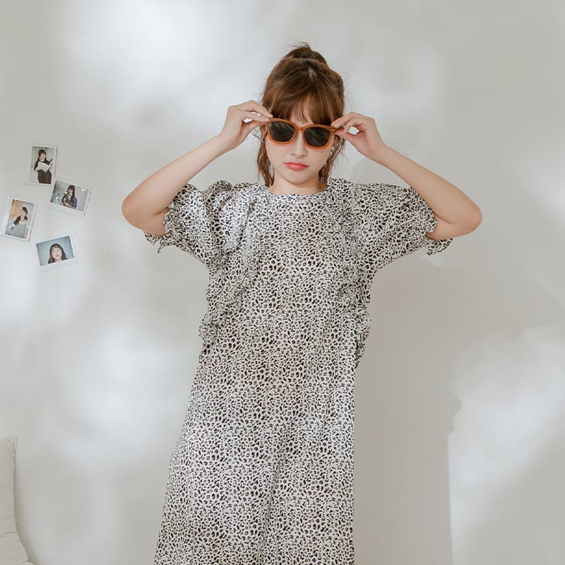 Space Picnic|豹紋抓皺後拉鍊綁帶洋裝【C21054025】