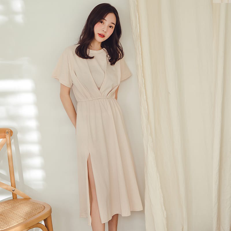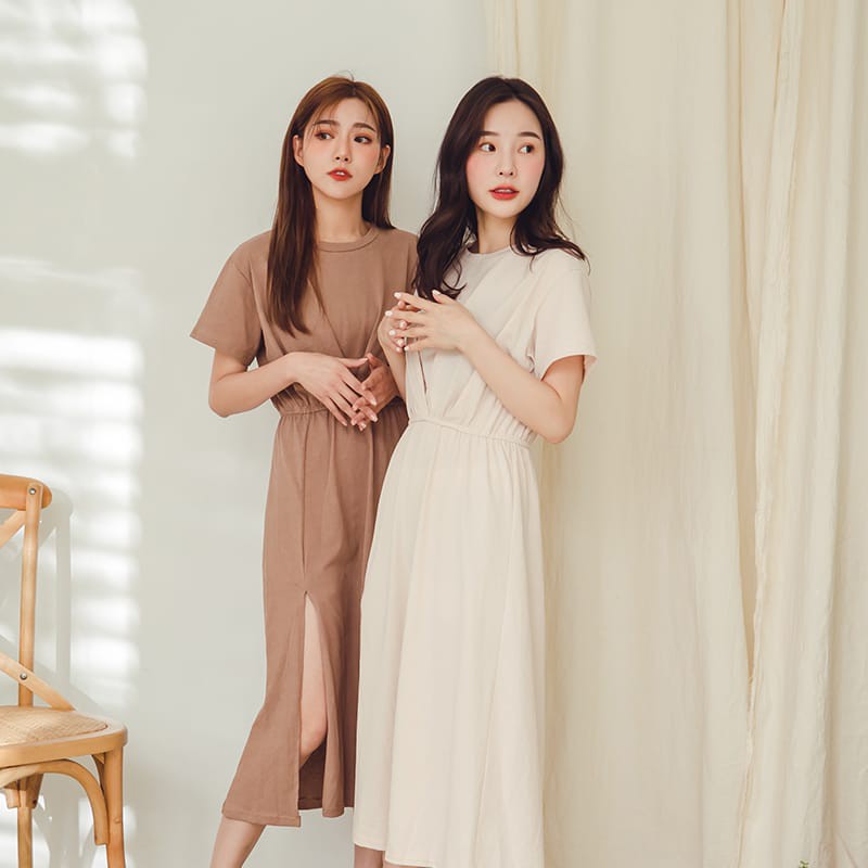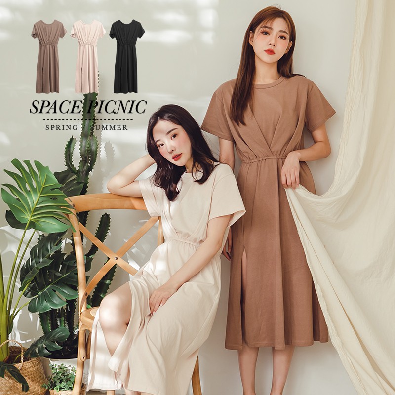Space Picnic|MIT-圓領縮腰前開衩短袖洋裝【C19063014】