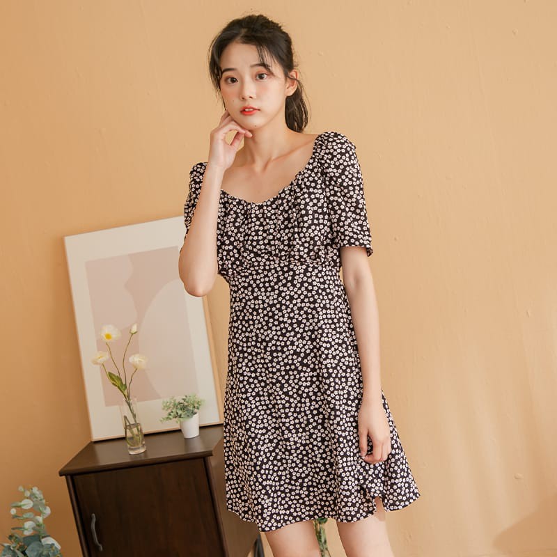 Space Picnic|鬆緊一字領綁帶小花雪紡洋裝【C21052005】