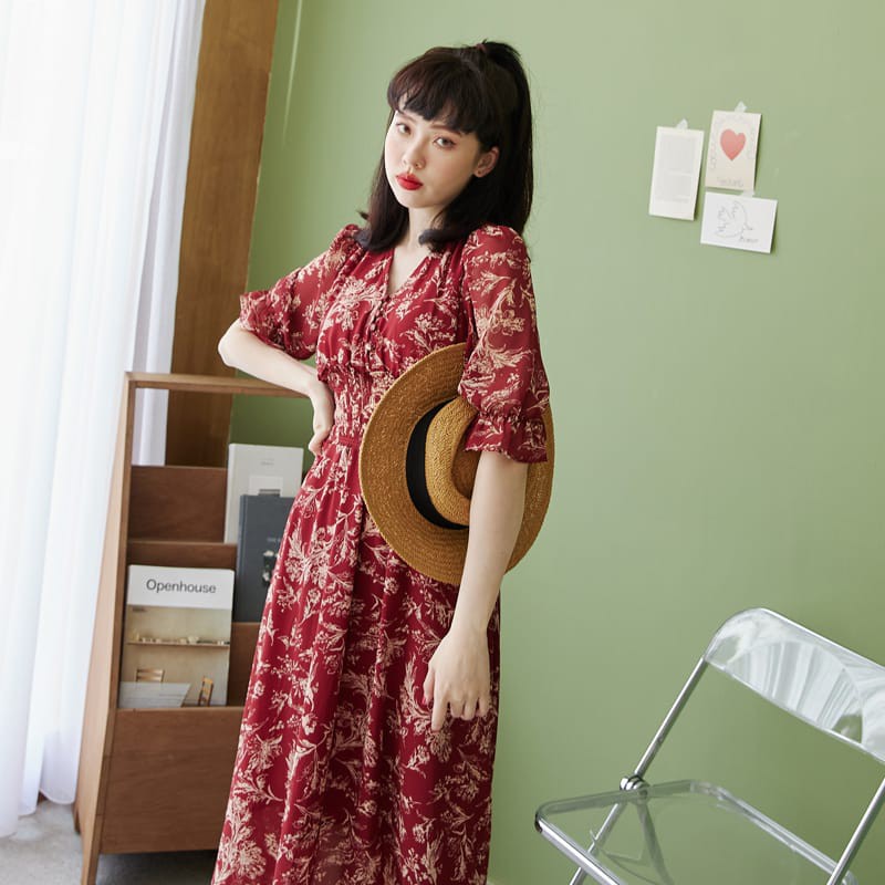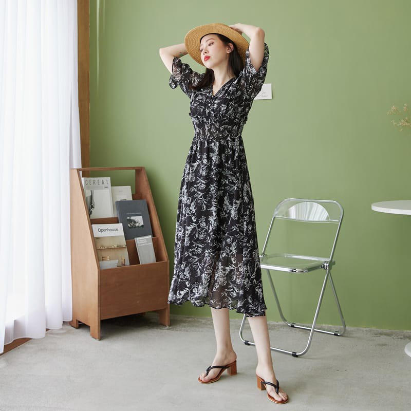 Space Picnic|-5kg線條花朵高腰微透短袖洋裝【C21054097】