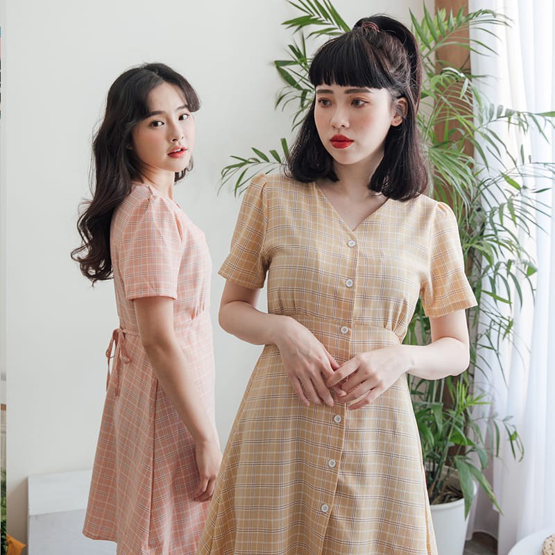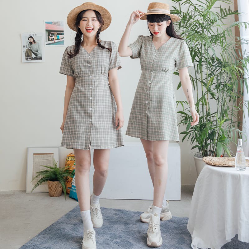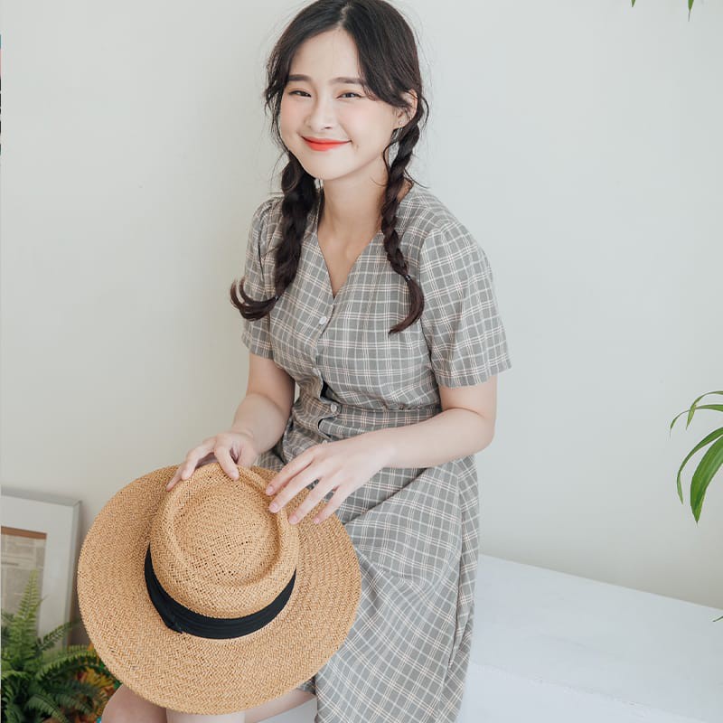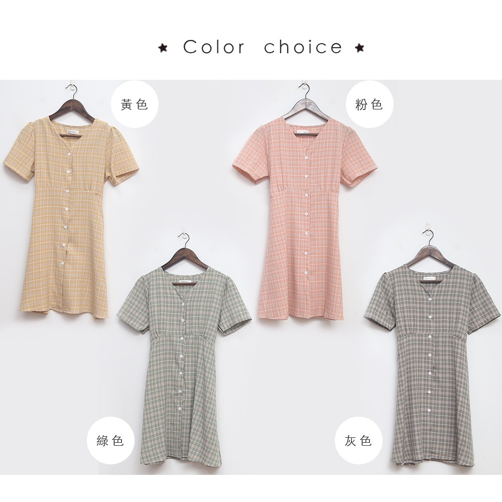 Space Picnic|V領格紋綁帶短袖洋裝【C21034032】