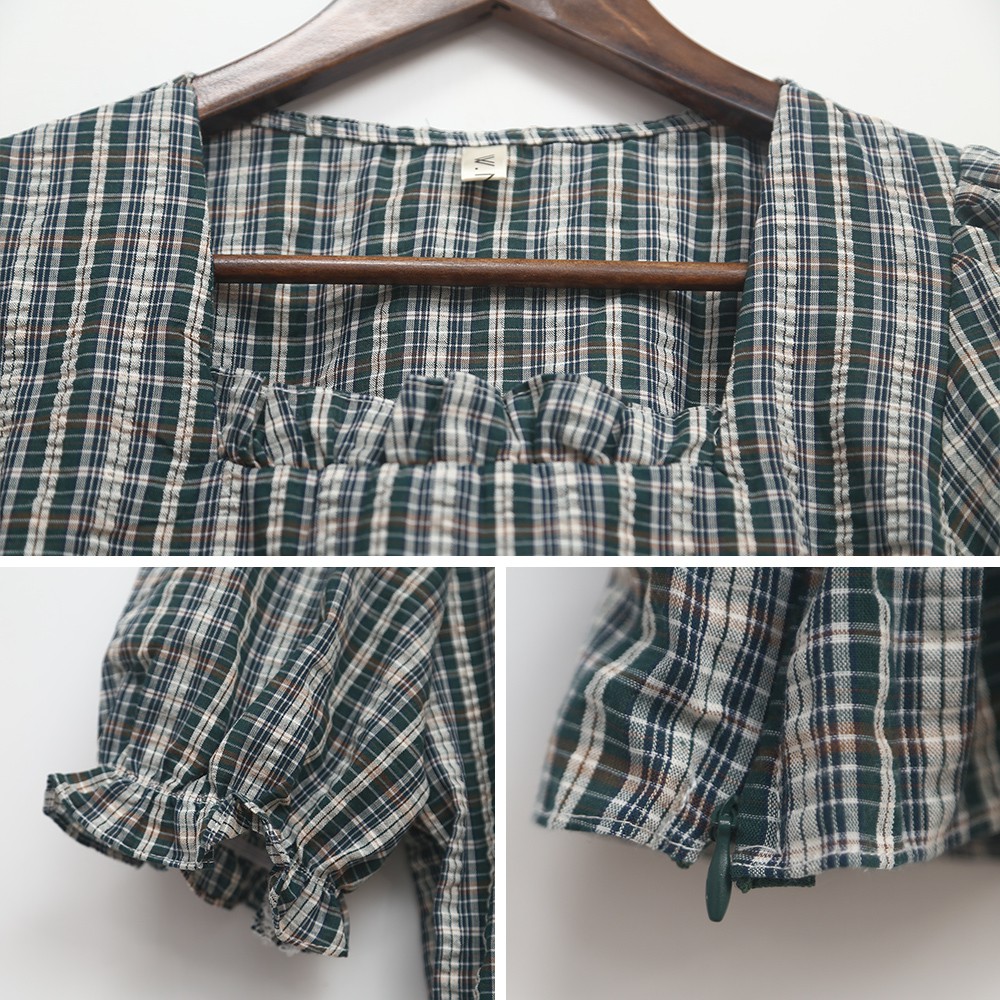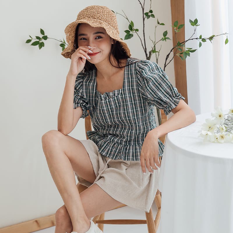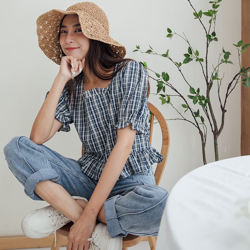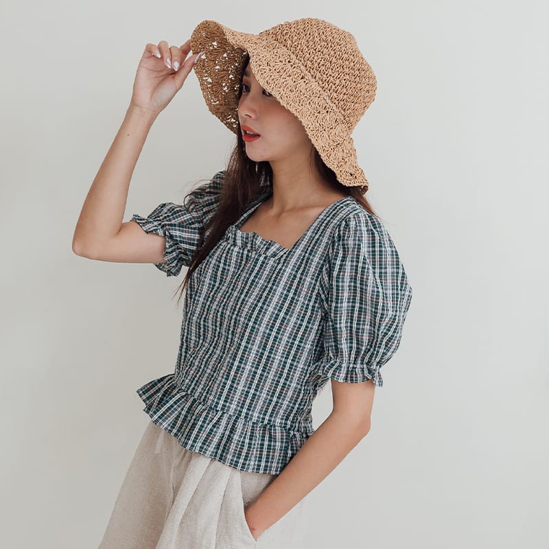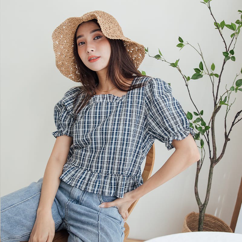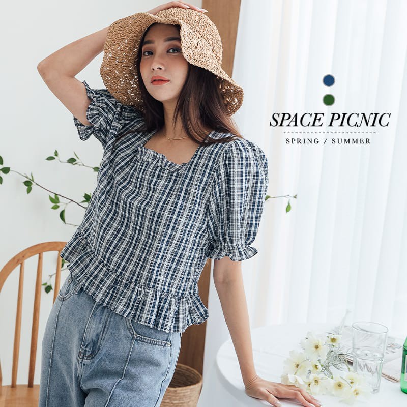 Space Picnic|格紋方領魚尾短袖上衣【C21052082】