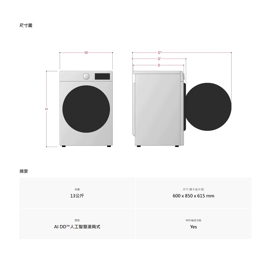 LG 樂金 WD-S13VDW 蒸洗脫烘 蝦幣10%回饋 滾筒洗衣機 洗衣13公斤+烘衣8公斤 WT-SD201AHW