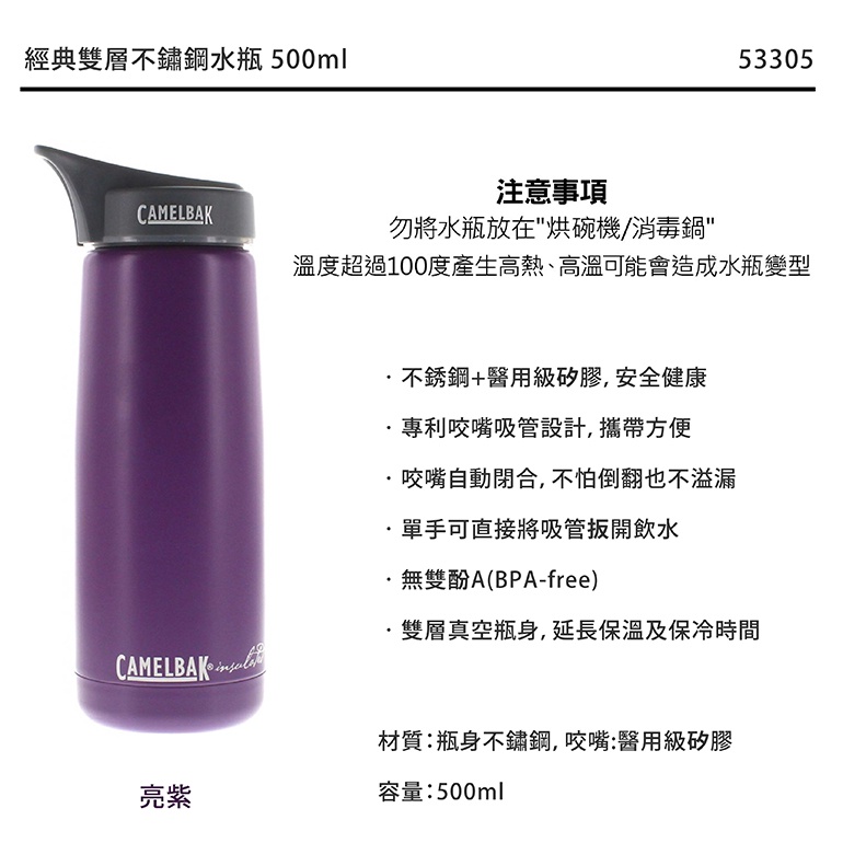 CamelBak 美國 經典雙層不鏽鋼水瓶 500ml 亮紫 專利咬嘴吸管/防漏/不含雙酚A 52CB-53305