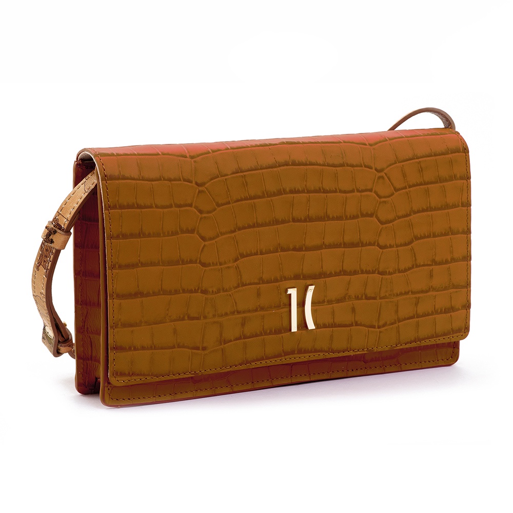 【Alviero Martini 義大利地圖包 】時尚鱷魚紋 小牛皮手拿側揹兩用包23cm-咖啡色