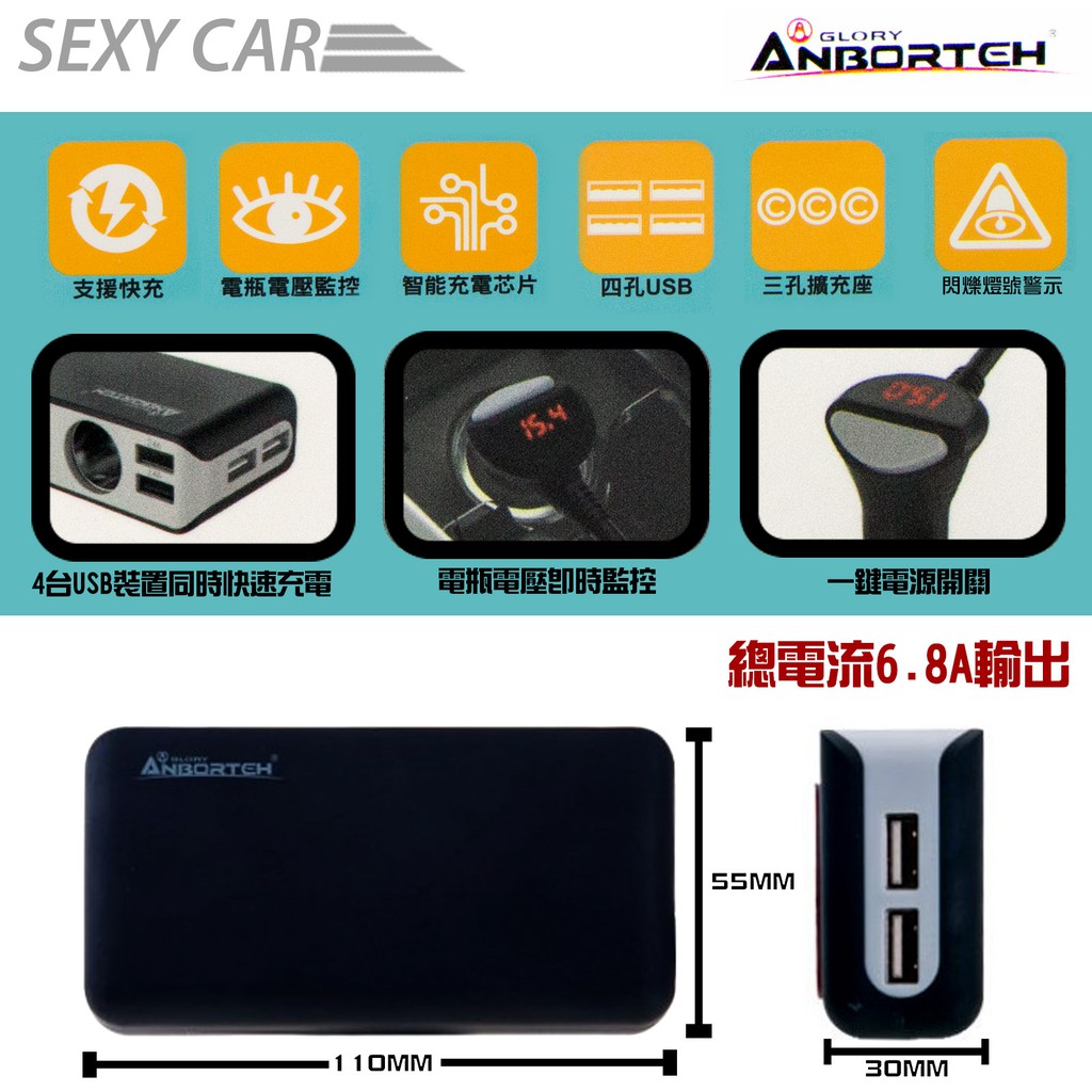 安伯特 酷電大師智能監控電壓車充座3孔+4USB ABT-E054 -SC 3孔點菸器 一鍵開關 自動斷電 過熱保護