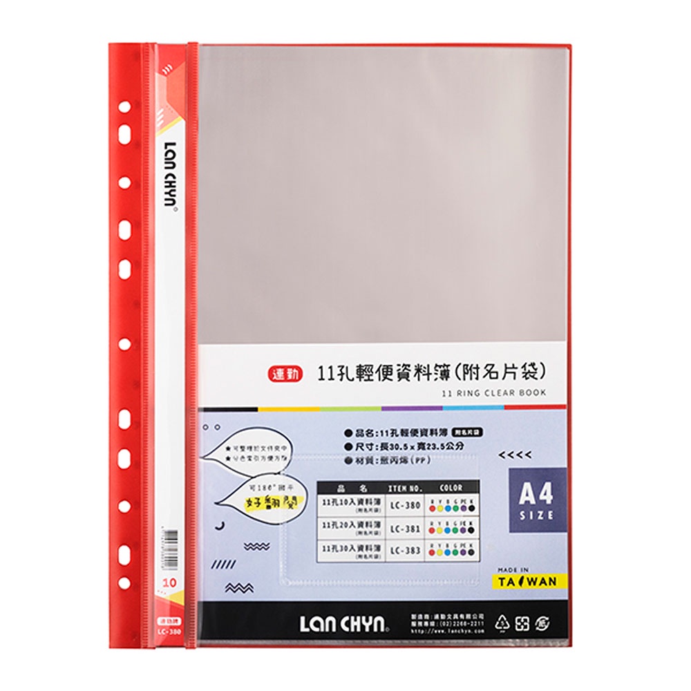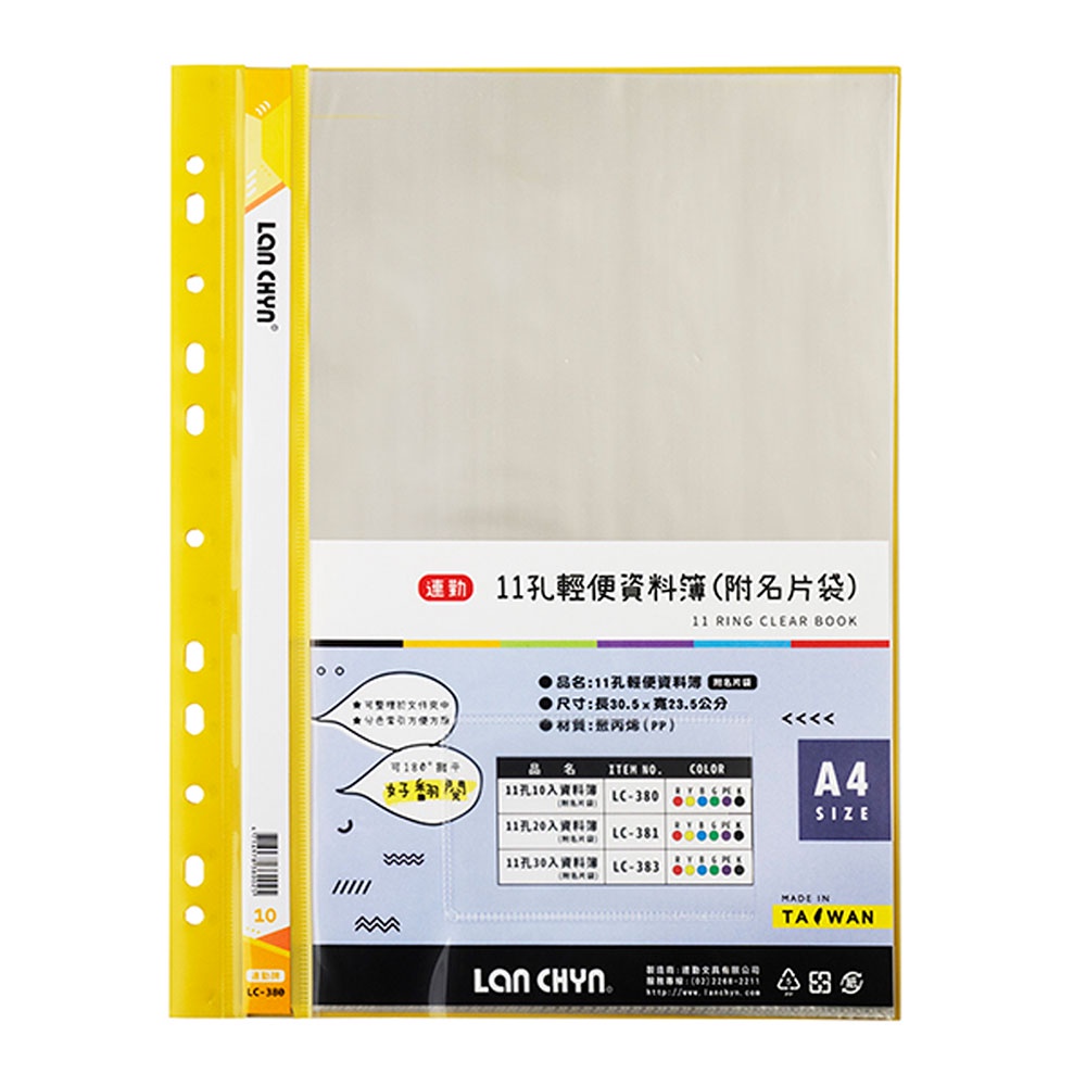 連勤LAN CHYN 11孔PP軟質資料簿 LC-380 10張 附名片袋 藍 黃 黑 紅 綠 文件夾 資料夾|史泰博